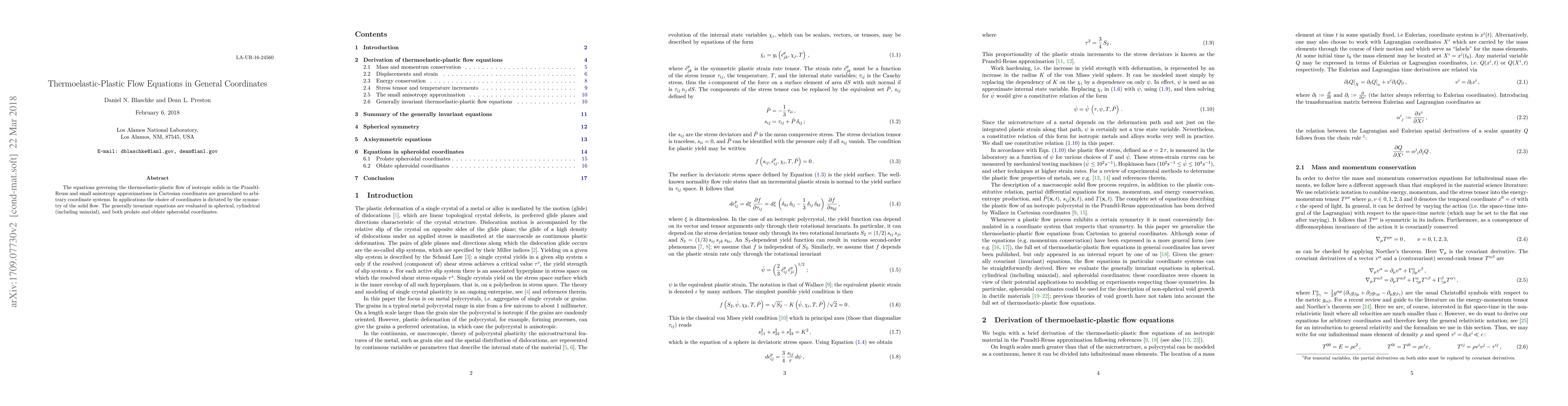The equations governing the thermoelastic-plastic flow of isotropic solids in the Prandtl-Reuss and small anisotropy approximations in Cartesian coordinates are generalized to arbitrary coordinate systems. In applications the choice of coordinates is dictated by the symmetry of the solid flow. The generally invariant equations are evaluated in spherical, cylindrical (including uniaxial), and both prolate and oblate spheroidal coordinates.