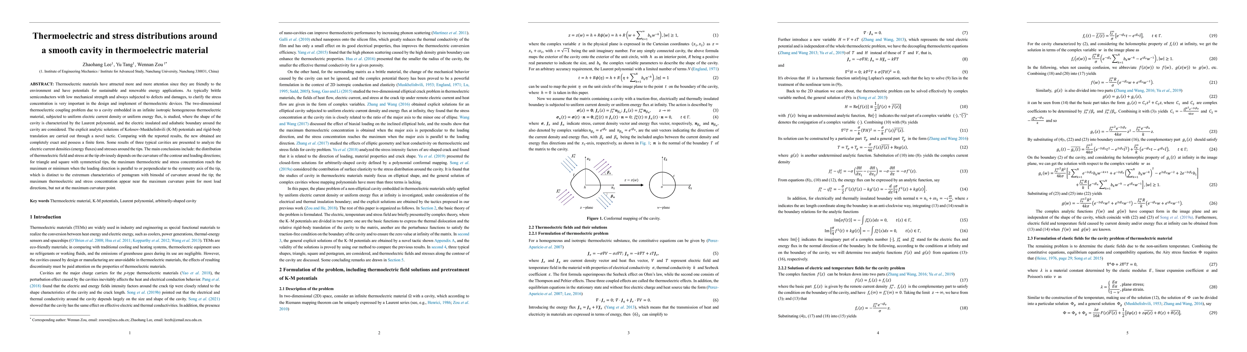 This paper studies the thermoelectric and stress distributions around smooth cavities in thermoelectric materials using a novel analytic approach. The results show that the curvature and loading direction significantly influence the stress and thermoelectric field concentrations, with maximum values often occurring near, but not exactly at, the points of maximum curvature.