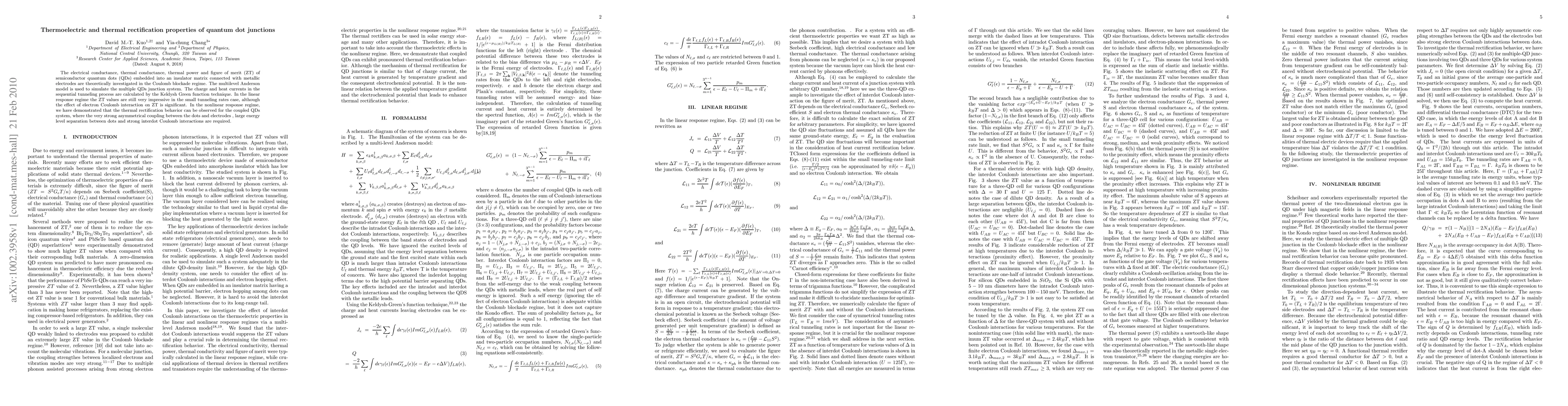 This paper investigates the thermoelectric and thermal rectification properties of quantum dot junctions using the multilevel Anderson model and Keldysh Green function technique. It finds impressive ZT values in the linear response regime, while thermal rectification is observed in the nonlinear regime with strong asymmetrical coupling and interdot interactions.