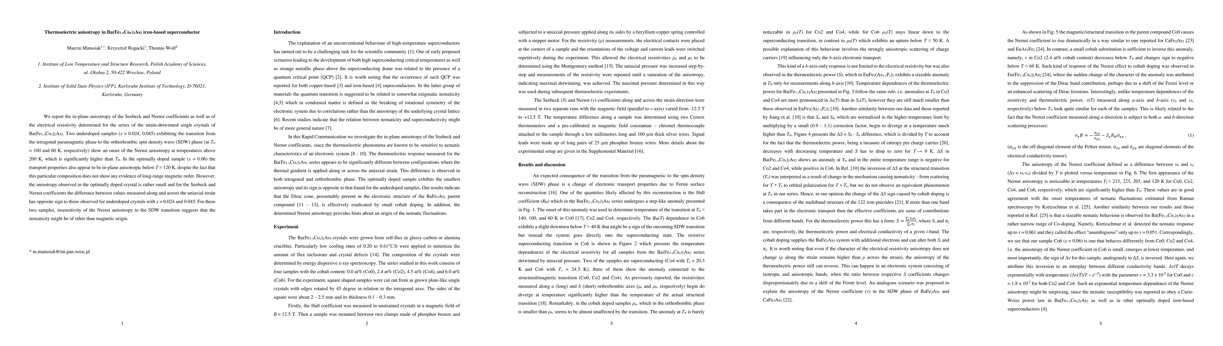 Researchers studied a type of superconductor that exhibits in-plane anisotropy in its electrical resistivity, Seebeck, and Nernst coefficients, which varies depending on the direction of measurement.
