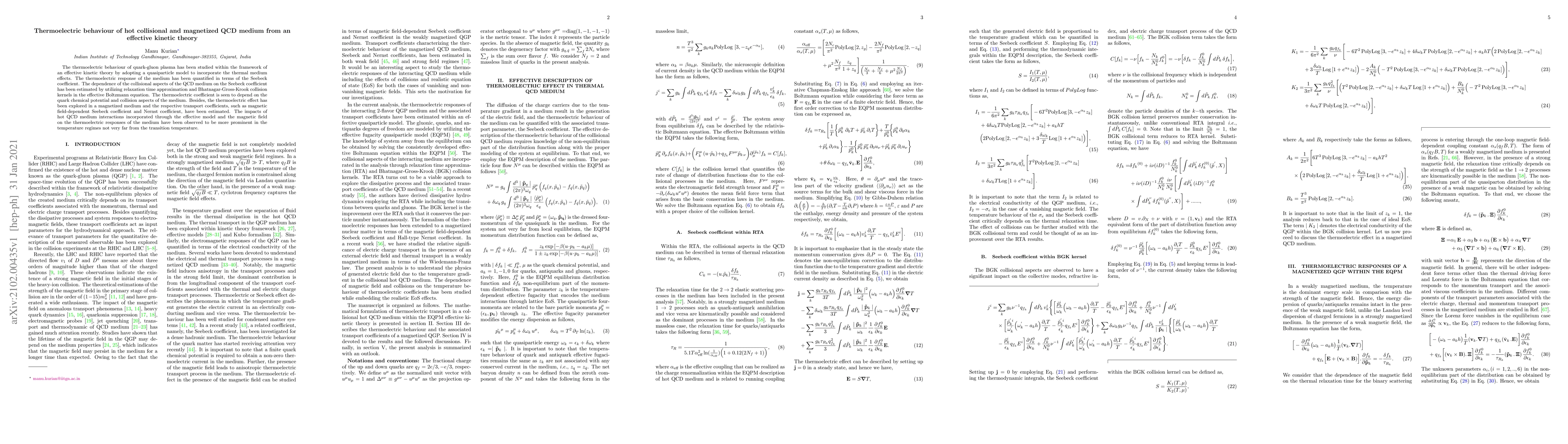 This paper investigates the thermoelectric behavior of a hot, collisional, and magnetized quark-gluon plasma using an effective kinetic theory. The study quantifies the thermoelectric response in terms of the Seebeck coefficient, revealing its dependence on quark chemical potential and collisional properties, and explores the effects of magnetic fields on transport coefficients.