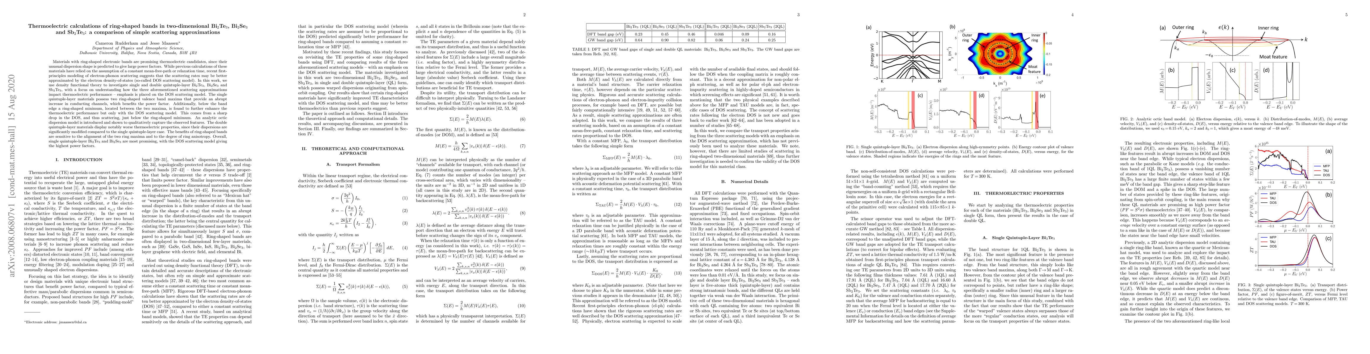 This paper investigates thermoelectric properties of single and double quintuple-layer Bi$_2$Te$_3$, Bi$_2$Se$_3$, and Sb$_2$Te$_3$ using density functional theory and three scattering models. It finds that ring-shaped bands significantly enhance thermoelectric performance, especially with the DOS scattering model, which captures a sharp drop in scattering just below the ring minimum.