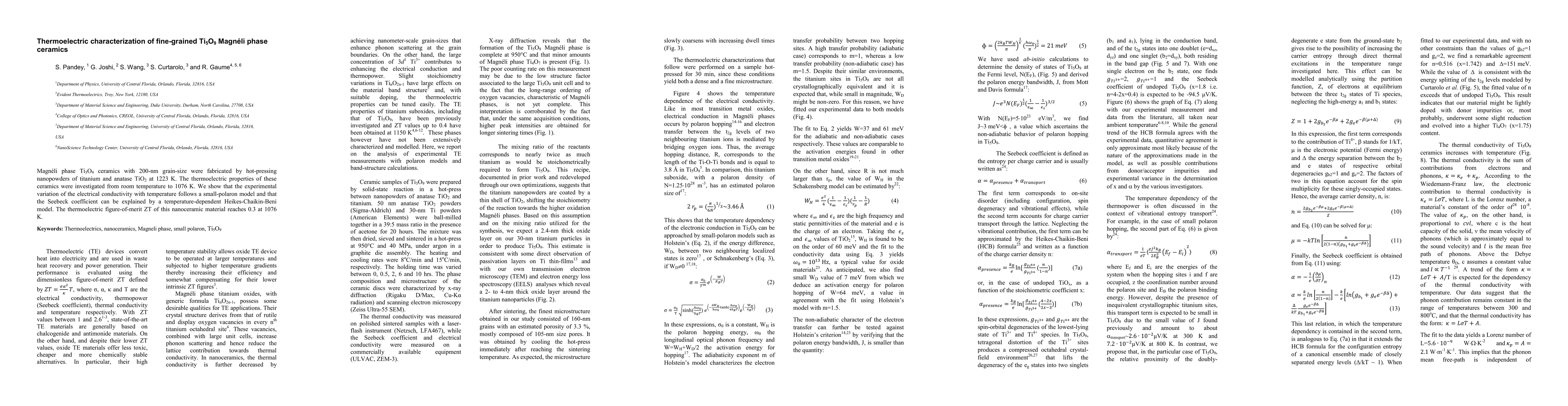This study fabricates fine-grained Ti5O9 Magneli phase ceramics via hot-pressing nanopowders and investigates their thermoelectric properties. The material exhibits a thermoelectric figure-of-merit (ZT) of 0.3 at 1076 K, with electrical conductivity and Seebeck coefficient variations explained by small-polaron and Heikes-Chaikin-Beni models, respectively.