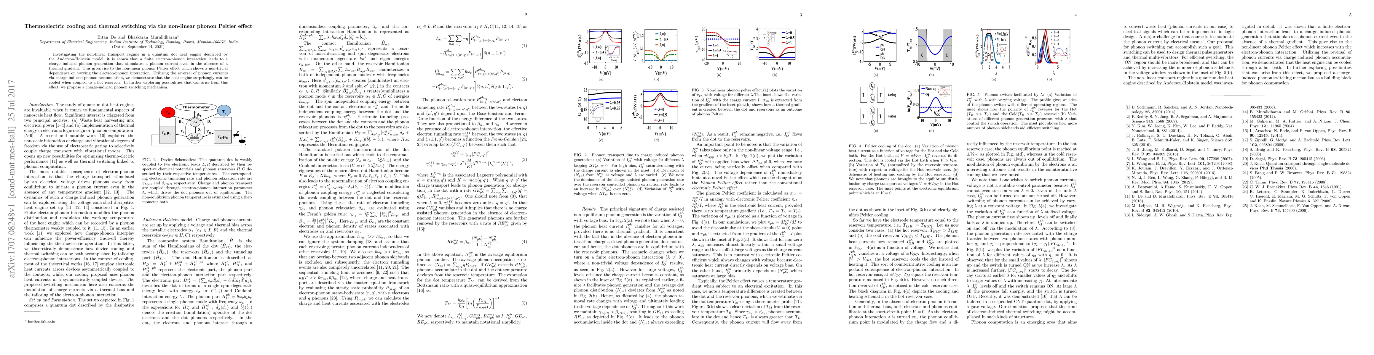 This paper explores the non-linear phonon Peltier effect in a quantum dot heat engine, revealing that electron-phonon interactions can generate phonon currents without a thermal gradient. The study demonstrates thermoelectric cooling and proposes a charge-induced phonon switching mechanism via phonon accumulation.