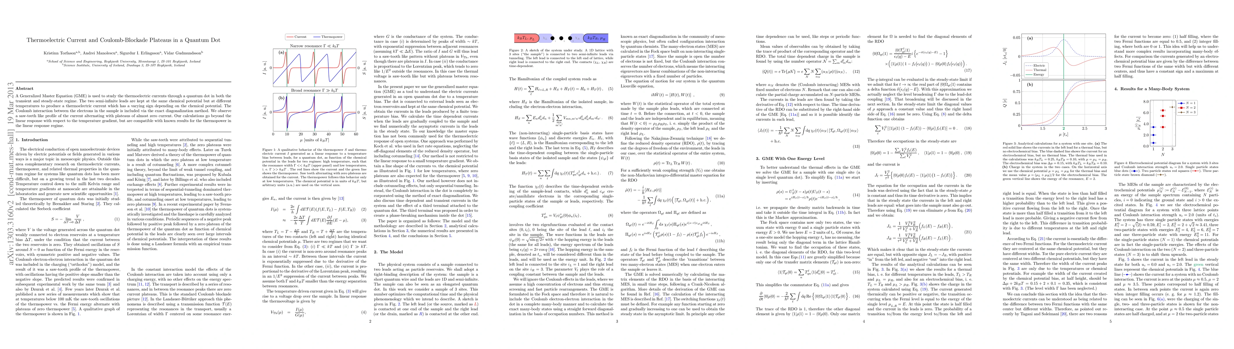 A Generalized Master Equation (GME) is used to study the thermoelectric currents through a quantum dot in both the transient and steady-state regime. The two semi-infinite leads are kept at the same chemical potential but at different temperatures to produce a thermoelectric current which has a varying sign depending on the chemical potential. The Coulomb interaction between the electrons in the sample is included via the exact diagonalization method. We observe a saw-teeth like profile of the current alternating with plateaus of almost zero current. Our calculations go beyond the linear response with respect to the temperature gradient, but are compatible with known results for the thermopower in the linear response regime.