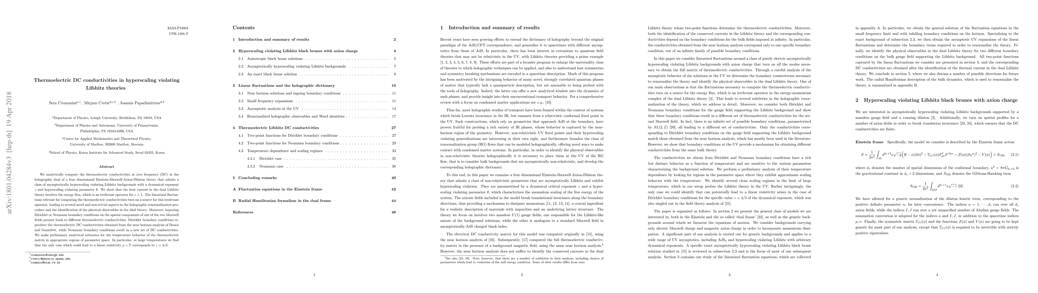 We analytically compute the thermoelectric conductivities at zero frequency (DC) in the holographic dual of a four dimensional Einstein-Maxwell-Axion-Dilaton theory that admits a class of asymptotically hyperscaling violating Lifshitz backgrounds with a dynamical exponent $z$ and hyperscaling violating parameter $\theta$. We show that the heat current in the dual Lifshitz theory involves the energy flux, which is an irrelevant operator for $z>1$. The linearized fluctuations relevant for computing the thermoelectric conductivities turn on a source for this irrelevant operator, leading to several novel and non-trivial aspects in the holographic renormalization procedure and the identification of the physical observables in the dual theory. Moreover, imposing Dirichlet or Neumann boundary conditions on the spatial components of one of the two Maxwell fields present leads to different thermoelectric conductivities. Dirichlet boundary conditions reproduce the thermoelectric DC conductivities obtained from the near horizon analysis of Donos and Gauntlett, while Neumann boundary conditions result in a new set of DC conductivities. We make preliminary analytical estimates for the temperature behavior of the thermoelectric matrix in appropriate regions of parameter space. In particular, at large temperatures we find that the only case which could lead to a linear resistivity $\rho \sim T$ corresponds to $z=4/3$.
