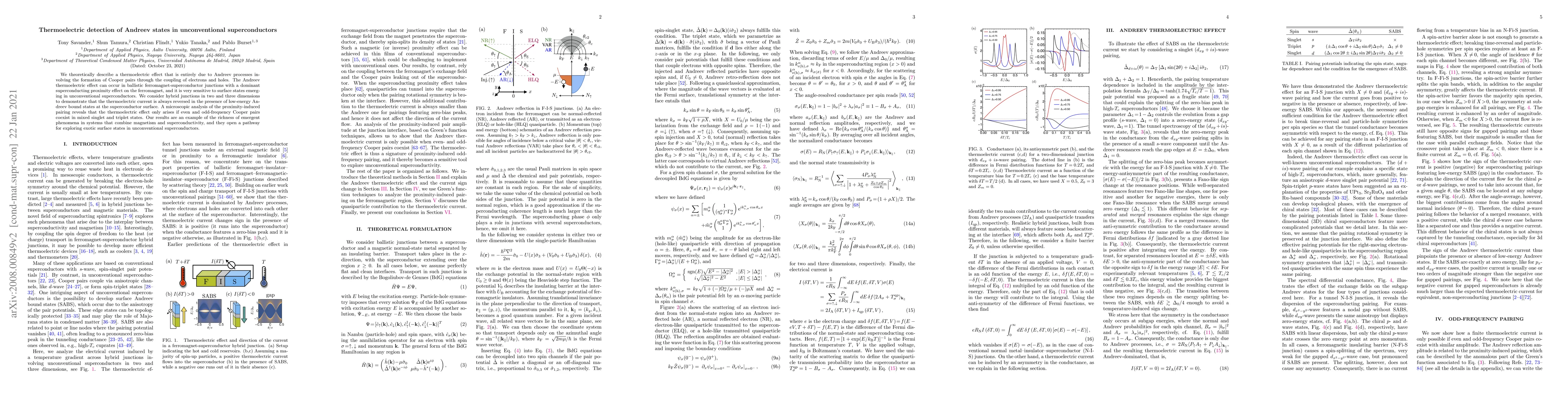 This paper theoretically describes a thermoelectric effect in unconventional superconductors due to Andreev processes, demonstrating that thermoelectric current reverses in hybrid junctions with low-energy Andreev bound states, revealing coexistence of even and odd-frequency Cooper pairs in mixed singlet and triplet states. This provides insight into emergent phenomena combining magnetism and superconductivity.