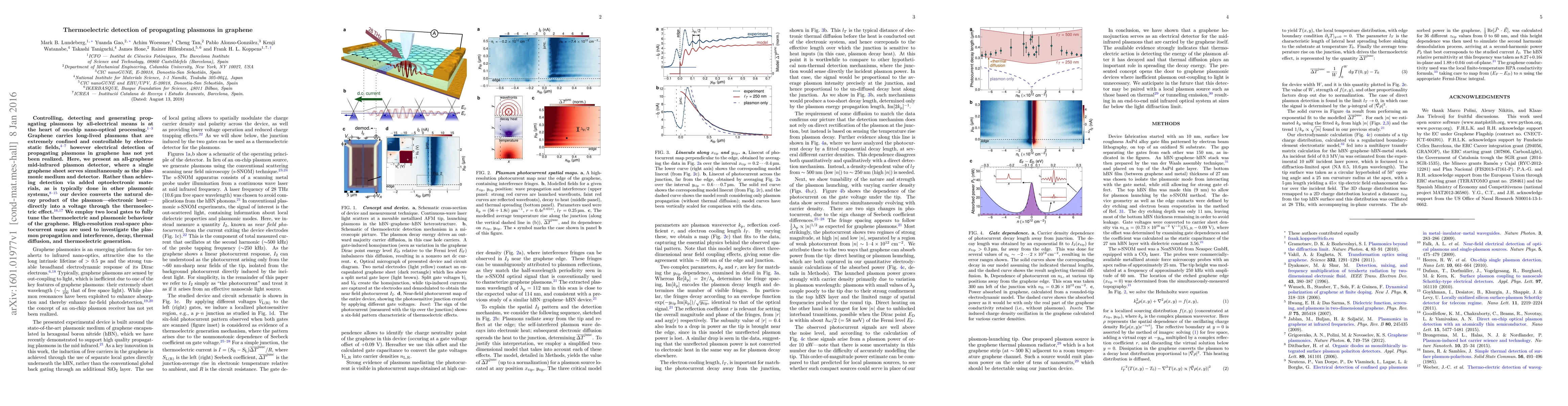 This paper introduces an all-graphene mid-infrared plasmon detector that detects propagating plasmons in graphene via the thermoelectric effect, eliminating the need for optoelectronic materials. The device employs local gates to tune thermoelectric and plasmonic behavior, enabling investigation of plasmon propagation, decay, and interference.