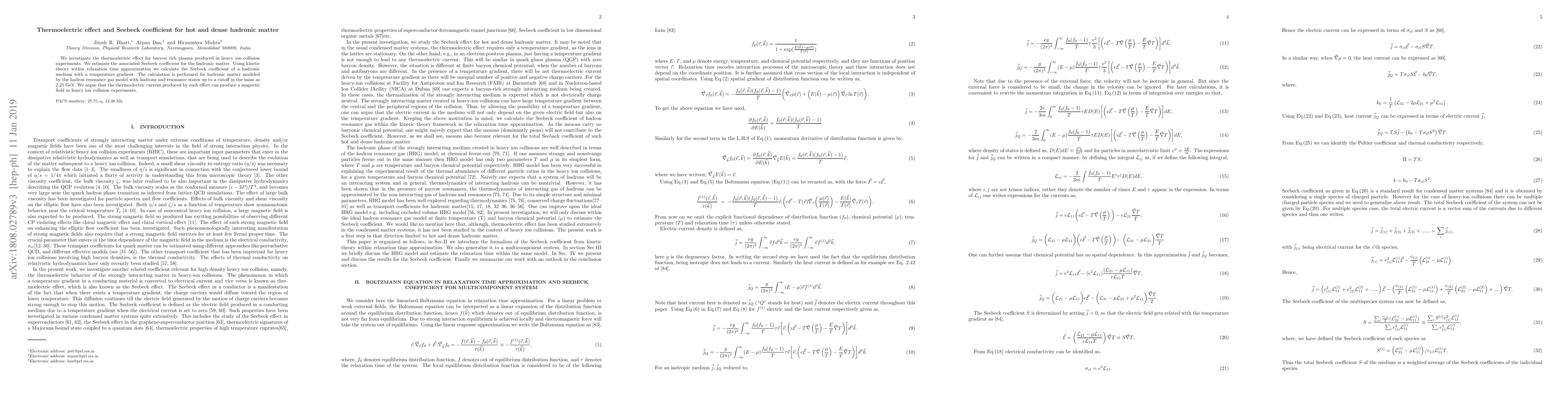 This paper investigates the thermoelectric effect in baryon-rich plasma from heavy ion collisions, estimating the Seebeck coefficient for dense hadronic matter using kinetic theory. The study suggests that thermoelectric currents may generate magnetic fields in such experimental settings.