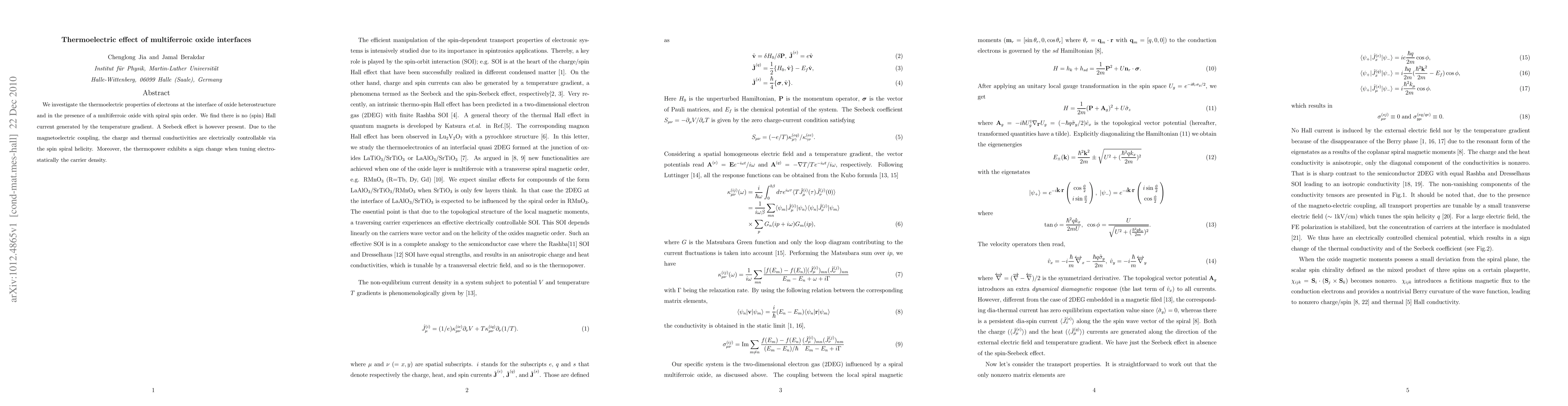 We investigate the thermoelectric properties of electrons at the interface of oxide heterostructure and in the presence of a multiferroic oxide with spiral spin order. We find there is no (spin) Hall current generated by the temperature gradient. A Seebeck effect is however present. Due to the magnetoelectric coupling, the charge and thermal conductivities are electrically controllable via the spin spiral helicity. Moreover, the thermopower exhibits a sign change when tuning electro-statically the carrier density.
