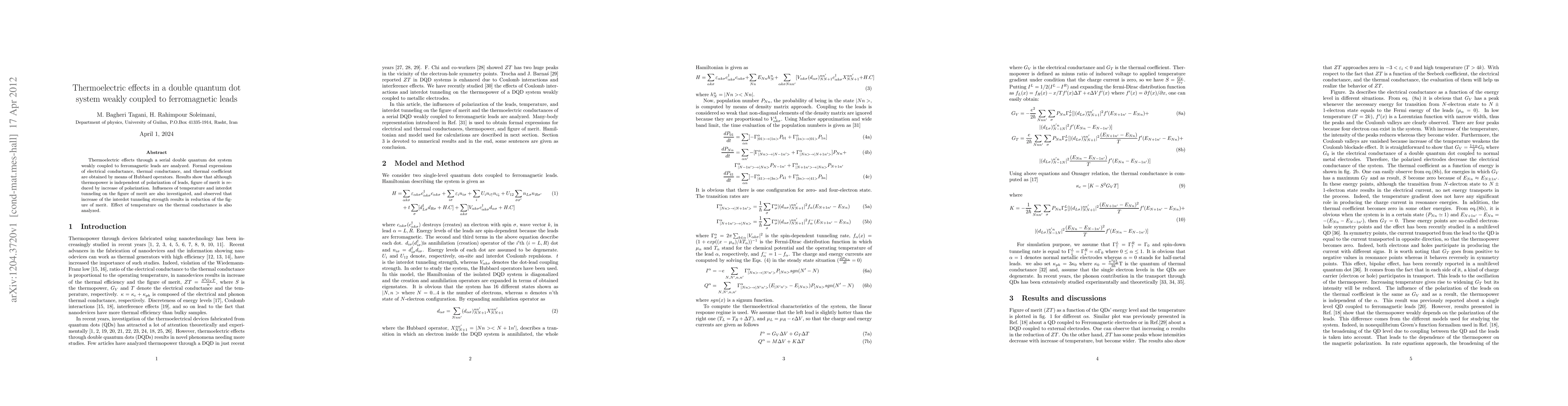This paper investigates thermoelectric effects in a double quantum dot system connected to ferromagnetic leads, deriving expressions for electrical and thermal conductance. It finds that while thermopower remains unaffected by lead polarization, increased polarization reduces the figure of merit, and higher interdot tunneling strength further diminishes it; temperature influences thermal conductance.