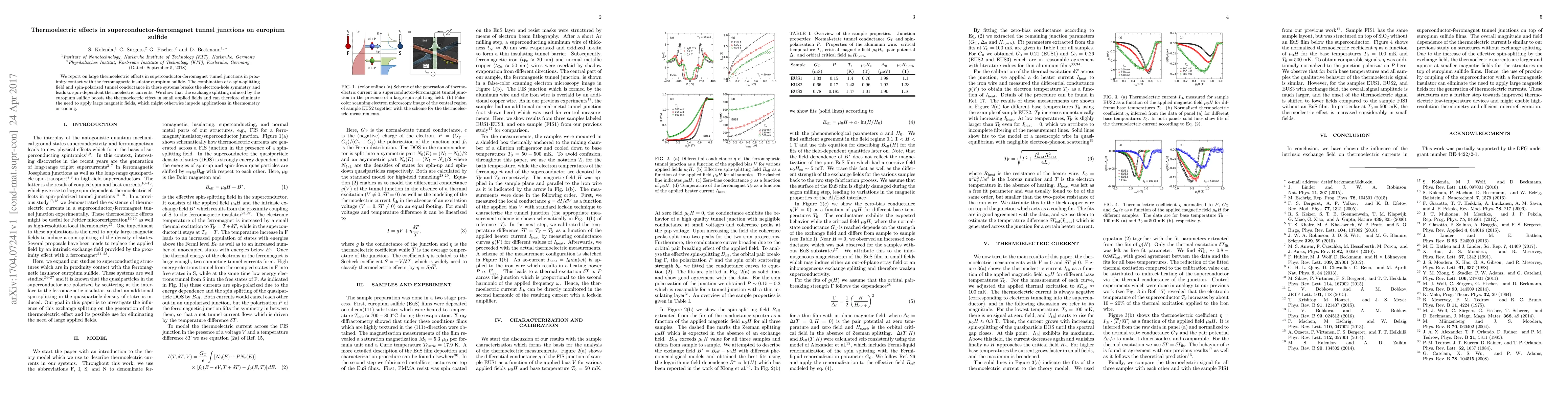 This study investigates large thermoelectric effects in superconductor-ferromagnet tunnel junctions with europium sulfide, revealing that spin-splitting and spin-polarized conductance break electron-hole symmetry, leading to enhanced thermoelectric currents. The exchange splitting from europium sulfide reduces the need for large magnetic fields, potentially improving applications in thermometry and cooling.