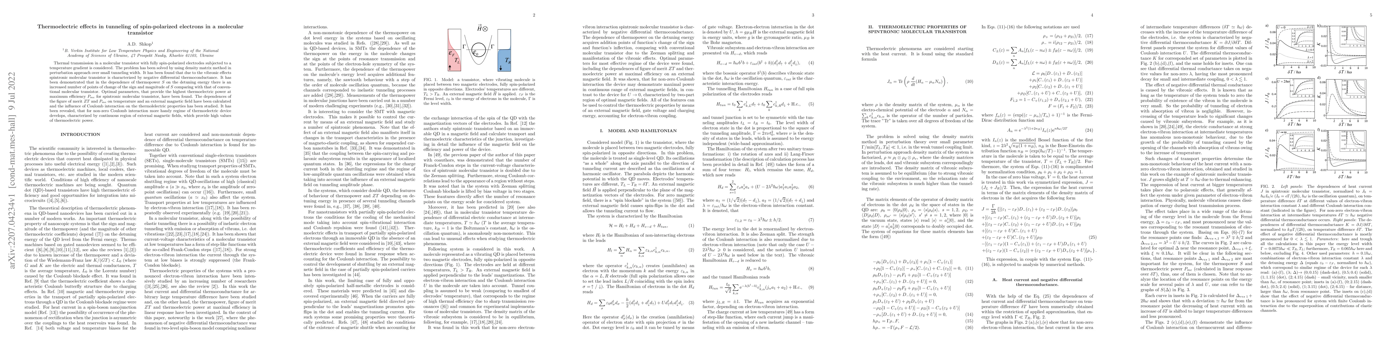 This paper investigates thermoelectric effects in a spintronic molecular transistor using a density matrix method. It finds negative differential thermoconductance due to vibronic effects and identifies optimal parameters for maximum thermoelectric efficiency, revealing enhanced thermoelectric properties under non-zero Coulomb interaction.