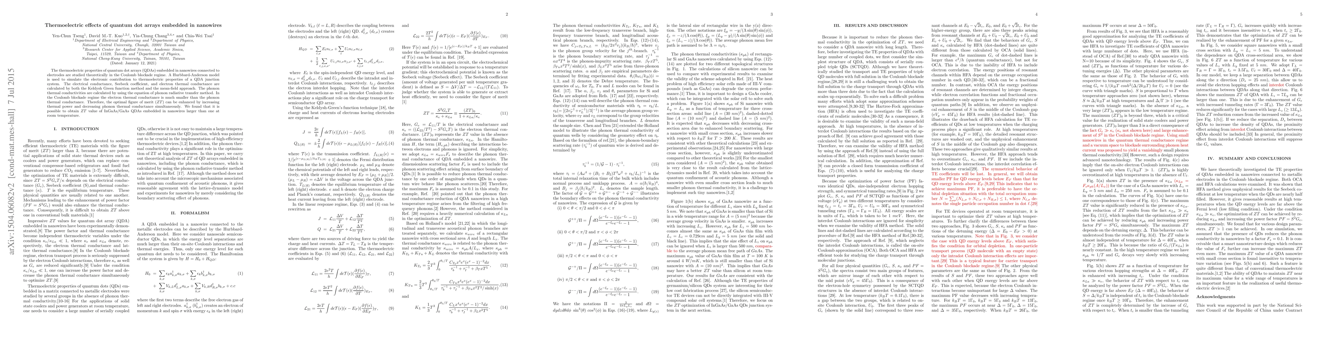 This paper investigates the thermoelectric properties of quantum dot arrays embedded in nanowires under Coulomb blockade conditions, using a Hubbard-Anderson model. The study finds that optimizing thermal power and reducing phonon thermal conductance can significantly enhance the figure of merit (ZT), achieving a ZT value greater than one for InGaAs/GaAs QDAs in nanowires at room temperature.