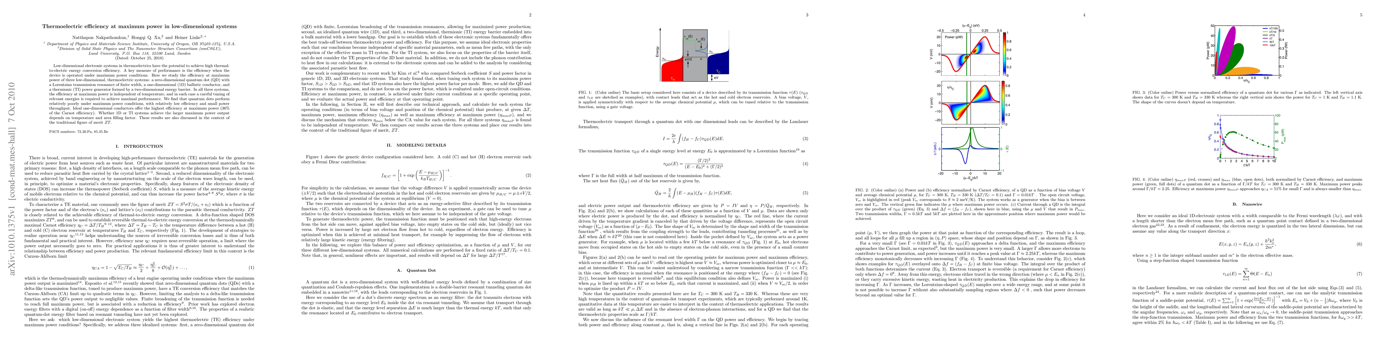 This paper investigates the thermoelectric efficiency at maximum power in three low-dimensional systems: a quantum dot, a one-dimensional ballistic conductor, and a thermionic power generator. It finds that while quantum dots perform poorly, ideal one-dimensional conductors achieve the highest efficiency (36% of Carnot efficiency), with thermionic systems' performance depending on temperature and area filling factor.