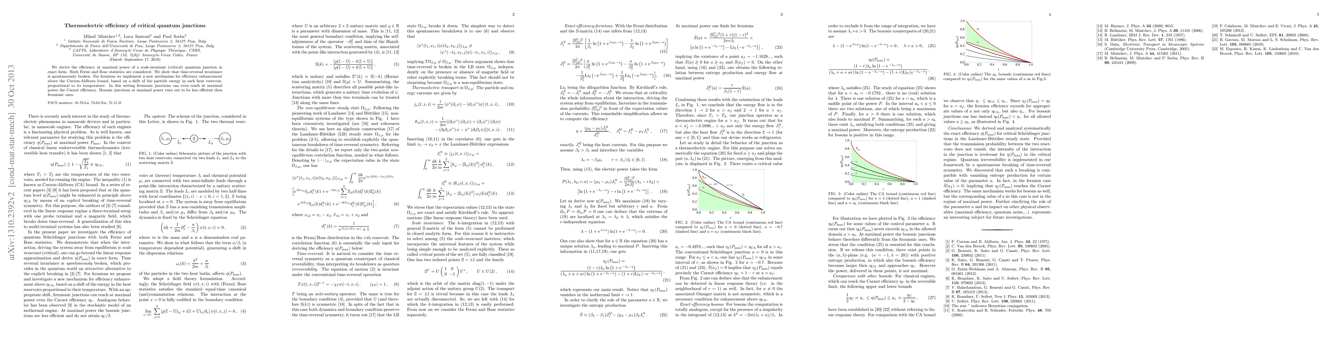 We derive the efficiency at maximal power of a scale-invariant (critical) quantum junction in exact form. Both Fermi and Bose statistics are considered. We show that time-reversal invariance is spontaneously broken. For fermions we implement a new mechanism for efficiency enhancement above the Curzon-Ahlborn bound, based on a shift of the particle energy in each heat reservoir, proportional to its temperature. In this setting fermionic junctions can even reach at maximal power the Carnot efficiency. The bosonic junctions at maximal power turn out to be less efficient then the fermionic ones.
