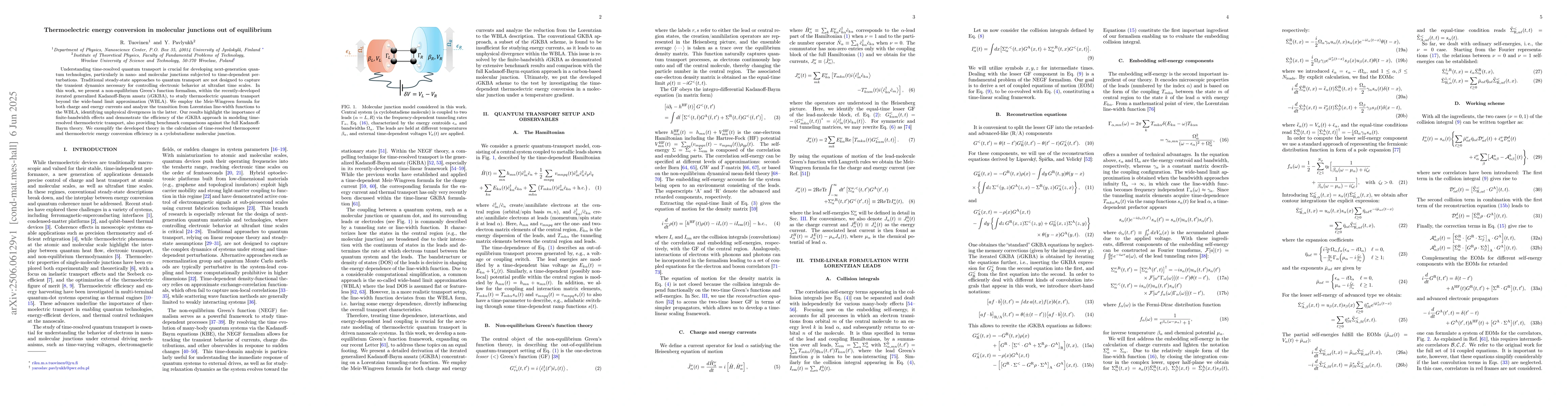 Understanding time-resolved quantum transport is crucial for developing next-generation quantum technologies, particularly in nano- and molecular junctions subjected to time-dependent perturbations. Traditional steady-state approaches to quantum transport are not designed to capture the transient dynamics necessary for controlling electronic behavior at ultrafast time scales. In this work, we present a non-equilibrium Green's function formalism, within the recently-developed iterated generalized Kadanoff-Baym ansatz ($i$GKBA), to study thermoelectric quantum transport beyond the wide-band limit approximation (WBLA). We employ the Meir-Wingreen formula for both charge and energy currents and analyze the transition from Lorentzian line-width functions to the WBLA, identifying unphysical divergences in the latter. Our results highlight the importance of finite-bandwidth effects and demonstrate the efficiency of the $i$GKBA approach in modeling time-resolved thermoelectric transport, also providing benchmark comparisons against the full Kadanoff-Baym theory. We exemplify the developed theory in the calculation of time-resolved thermopower and thermoelectric energy conversion efficiency in a cyclobutadiene molecular junction.