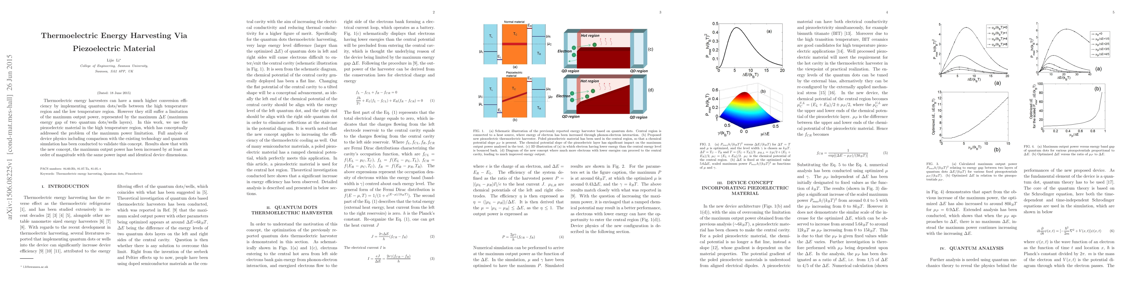 Thermoelectric energy harvesters can have a much higher conversion efficiency by implementing quantum dots/wells between the high temperature region and the low temperature region. However they still suffer a limitation of the maximum output power, represented by the maximum $\Delta E$ (maximum energy gap of two quantum dots/wells layers). In this work, we use the piezoelectric material in the high temperature region, which has conceptually addressed the problem of the maximum power limitation. Full analysis of device physics including comparison with the existing technology and quantum simulation has been conducted to validate this concept. Results show that with the new concept, the maximum output power has been increased by at least an order of magnitude with the same power input and identical device dimensions.
