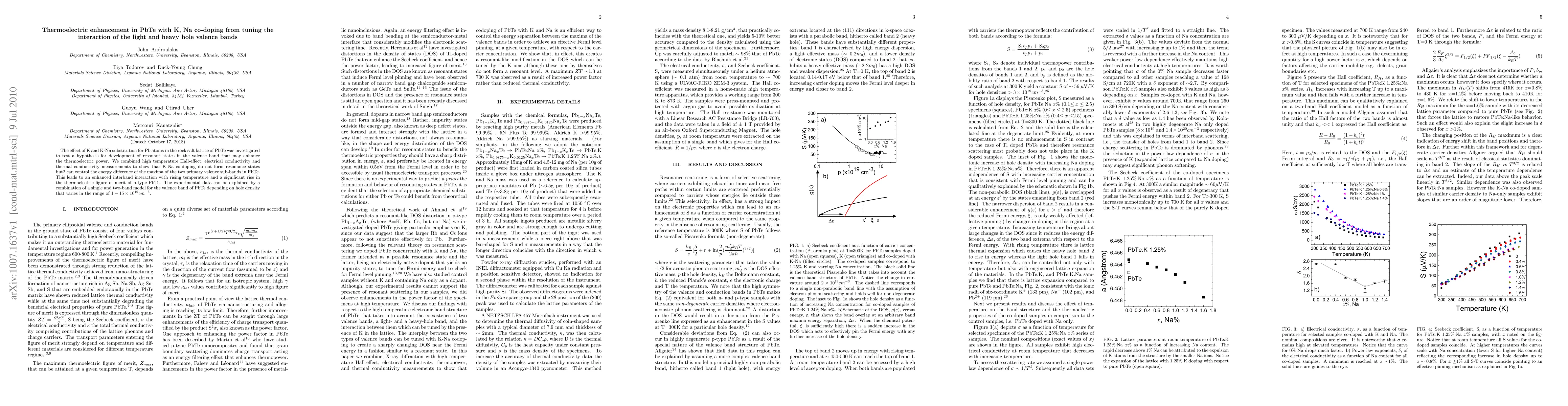 This study investigates the effect of K and Na doping in PbTe to enhance thermoelectric performance by tuning the interaction between light and heavy hole valence bands. The research shows that K-Na co-doping controls the energy difference between valence sub-bands, leading to improved interband interaction and a significant increase in the thermoelectric figure of merit for p-type PbTe.