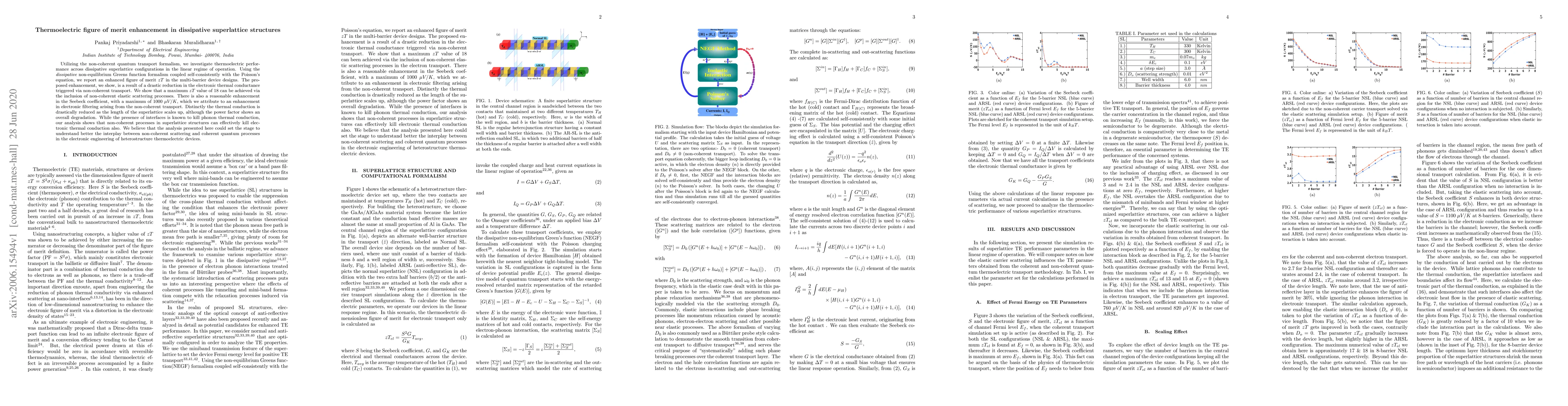 This paper investigates thermoelectric performance in dissipative superlattice structures using non-coherent quantum transport, reporting an enhanced thermoelectric figure of merit $zT$ due to reduced electronic thermal conductance. The study finds a maximum $zT$ value of 18 and a significant Seebeck coefficient enhancement, attributing these improvements to non-coherent elastic scattering processes.