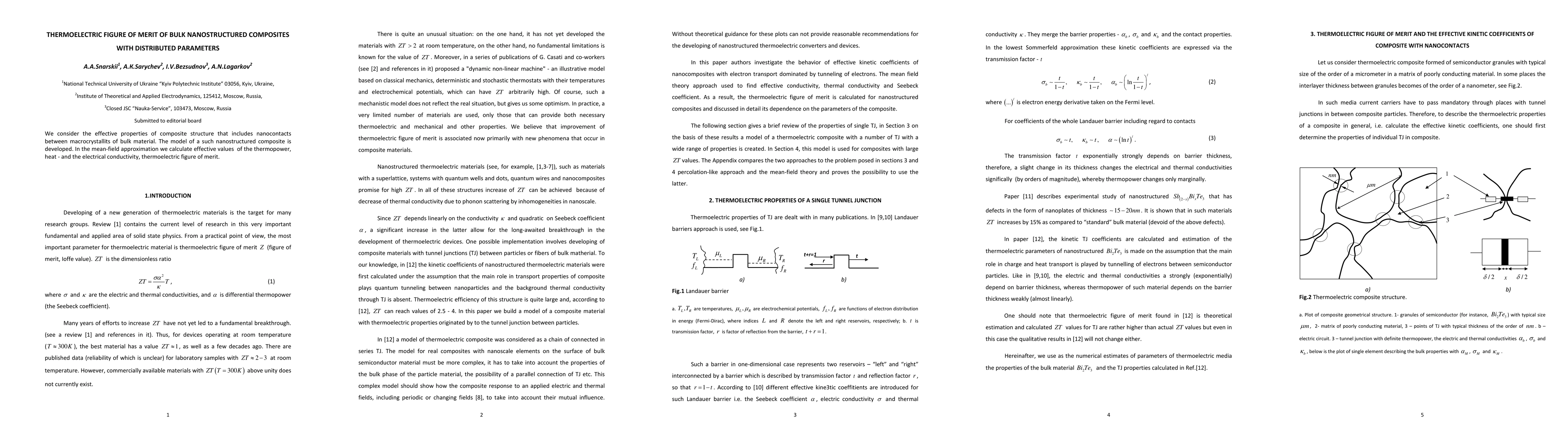 Summary: This paper develops a model for bulk nanostructured composites with nanocontacts between macrocrystals, calculating effective thermoelectric properties and the figure of merit using mean-field approximation. The study aims to understand the impact of distributed parameters on thermoelectric performance.