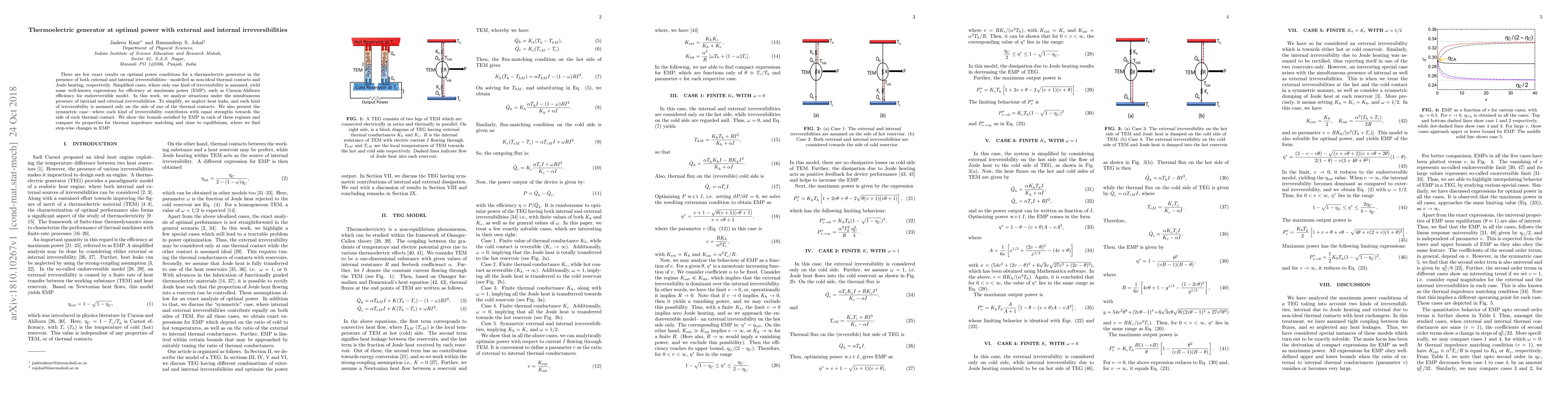 There are few exact results on optimal power conditions for a thermoelectric generator in the presence of both external and internal irreversibilities---modelled as non-ideal thermal contacts and Joule heating, respectively. Simplified cases, where only one kind of irreversibility is assumed, yield some well-known expressions for efficiency at maximum power (EMP), such as Curzon-Ahlborn efficiency for endoreversible model. In this work, we analyze situations under the simultaneous presence of internal and external irreversibilities. To simplify, we neglect heat leaks, and each kind of irreversibility is assumed only on the side of one of the thermal contacts. We also present the symmetric case---where each kind of irreversibility contributes with equal strengths towards the side of each thermal contact. We show the bounds satisfied by EMP in each of these regimes and compare its properties for thermal impedence matching and close to equilibrium, where we find step-wise changes in EMP.