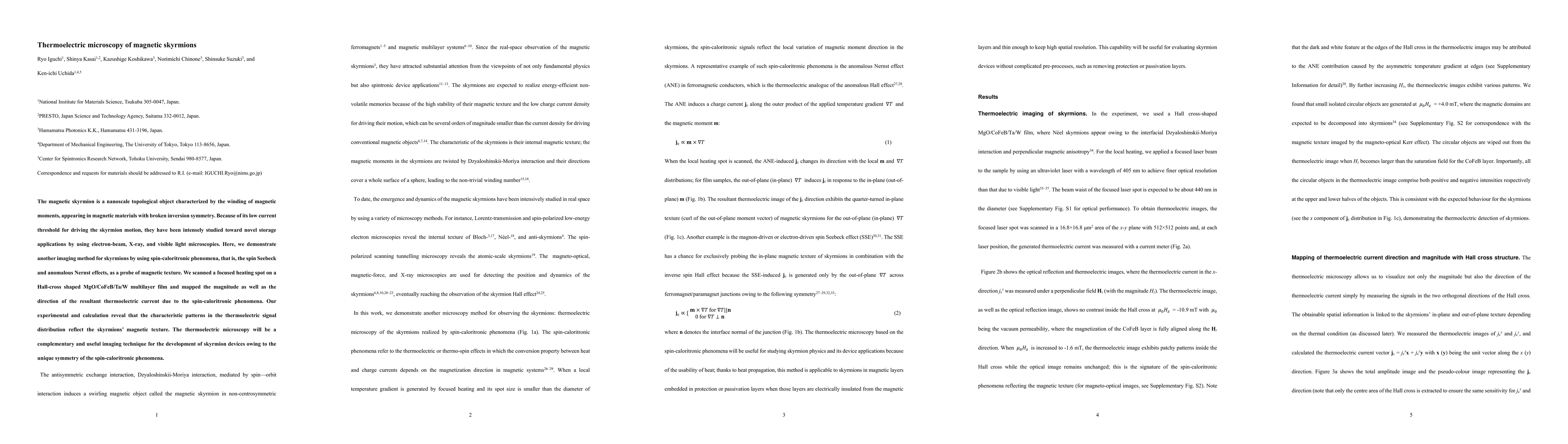 This paper demonstrates a novel thermoelectric microscopy technique for imaging magnetic skyrmions using spin-caloritronic phenomena and focused heating. The method enables mapping of skyrmion magnetic textures and observing their dynamics under current pulses, offering a promising approach for skyrmion device development.