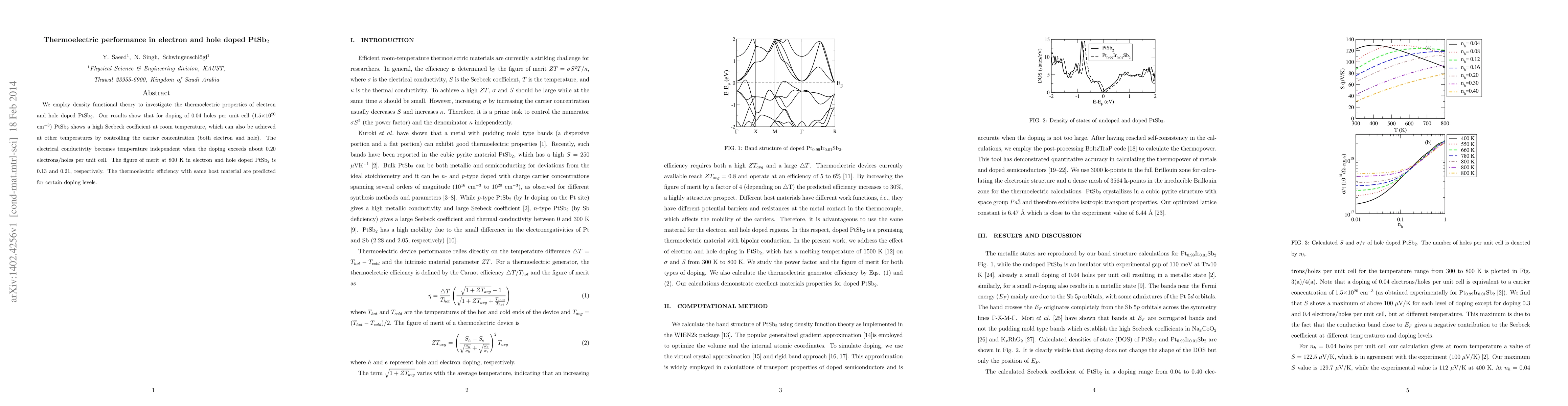 We employ density functional theory to investigate the thermoelectric properties of electron and hole doped PtSb$_2$. Our results show that for doping of 0.04 holes per unit cell (1.5$\times10^{20}$ cm$^{-3}$) PtSb$_2$ shows a high Seebeck coefficient at room temperature, which can also be achieved at other temperatures by controlling the carrier concentration (both electron and hole). The electrical conductivity becomes temperature independent when the doping exceeds about 0.20 electrons/holes per unit cell. The figure of merit at 800 K in electron and hole doped PtSb$_2$ is 0.13 and 0.21, respectively. The thermoelectric efficiency with same host material are predicted for certain doping levels.