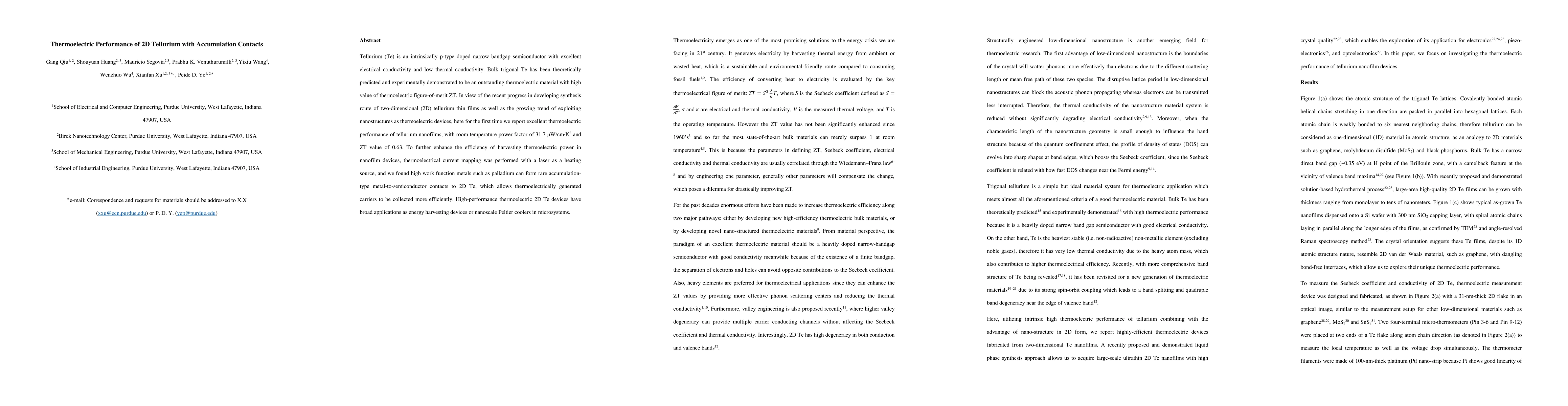 This paper reports the thermoelectric performance of 2D tellurium nanofilms, achieving a power factor of 31.7 μWcm⁻¹K⁻² and a ZT value of 0.63. High work function metals like palladium form accumulation contacts, enhancing thermoelectric efficiency in nanofilm devices.