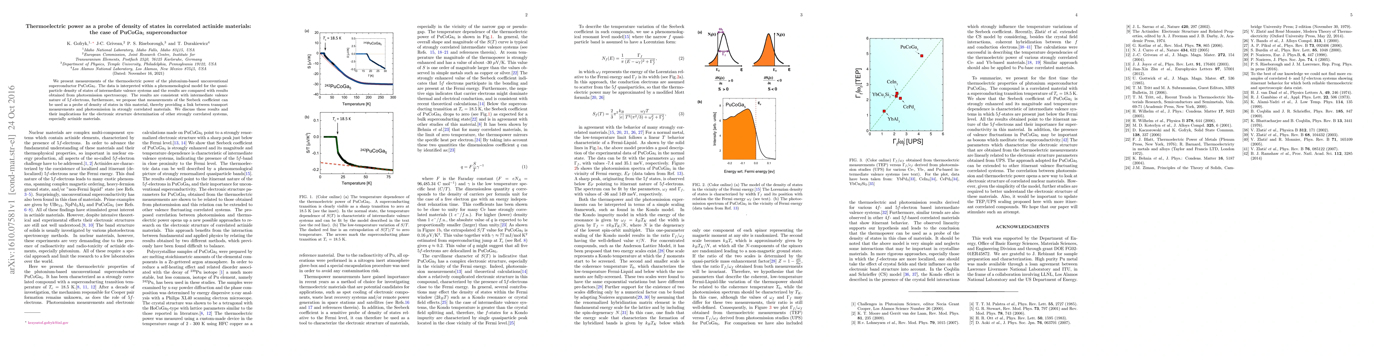 We present measurements of the thermoelectric power of the plutonium-based unconventional superconductor PuCoGa$_{5}$. The data is interpreted within a phenomenological model for the quasiparticle density of states of intermediate valence systems and the results are compared with results obtained from photoemission spectroscopy. The results are consistent with intermediate valence nature of 5$f$-electrons, furthermore, we propose that measurements of the Seebeck coefficient can be used as a probe of density of states in this material, thereby providing a link between transport measurements and photoemission in strongly correlated materials. We discuss these results and their implications for the electronic structure determination of other strongly correlated systems, especially actinide materials.