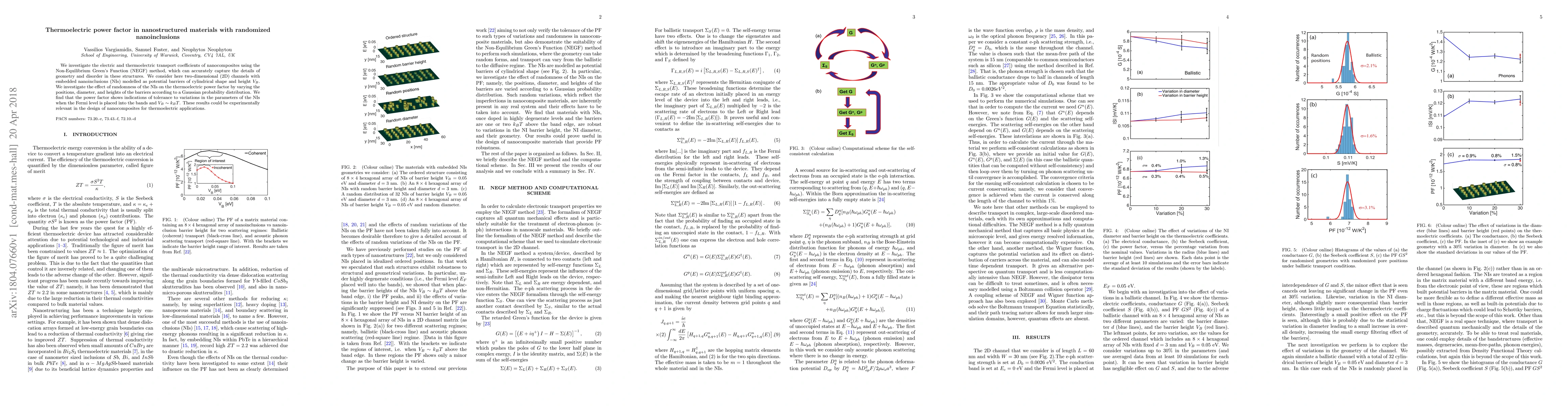 This study investigates nanocomposites with randomized nanoinclusions using the NEGF method to analyze their thermoelectric properties. The research finds that the thermoelectric power factor remains stable despite variations in nanoinclusion parameters when the Fermi level aligns with the inclusion height, suggesting potential for improved thermoelectric nanocomposite designs.