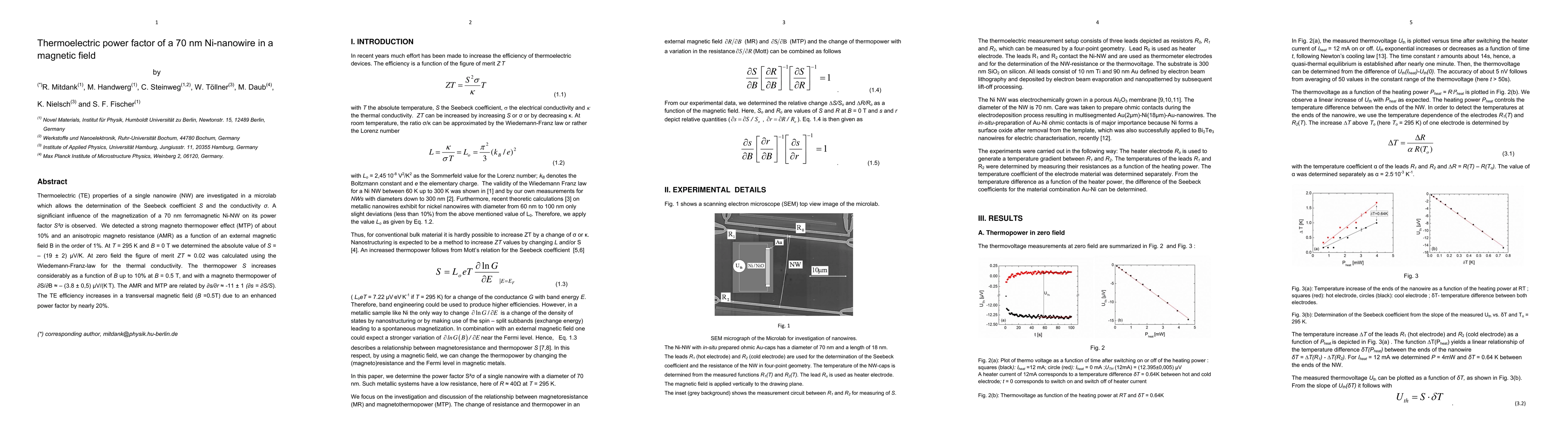 Researchers investigated thermoelectric properties in a 70 nm Ni-nanowire under magnetic fields, finding a strong magneto-thermopower effect that increases efficiency by nearly 20%.