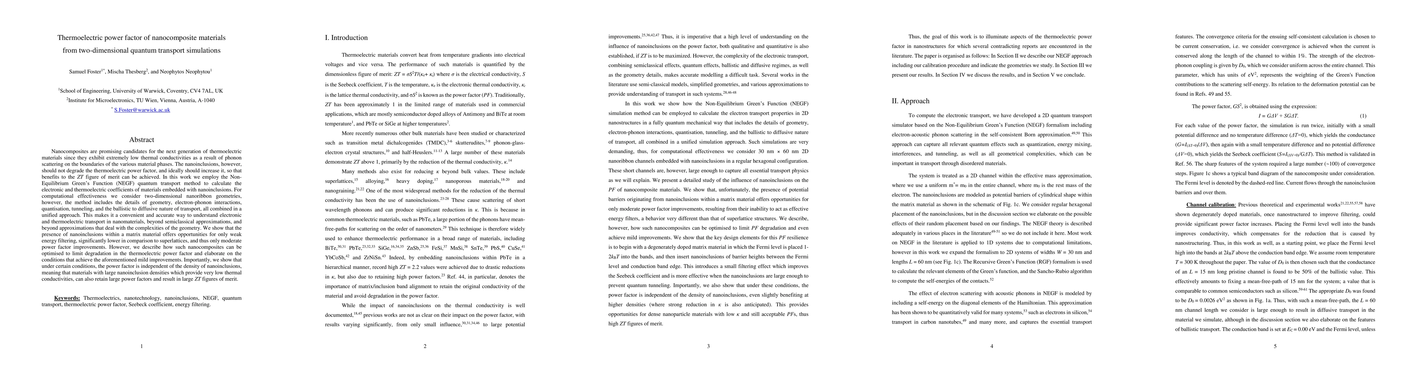 Nanocomposites are promising candidates for the next generation of thermoelectric materials since they exhibit extremely low thermal conductivities as a result of phonon scattering on the boundaries of the various material phases. The nanoinclusions, however, should not degrade the thermoelectric power factor, and ideally should increase it, so that benefits to the ZT figure of merit can be achieved. In this work we employ the Non-Equilibrium Greens Function (NEGF) quantum transport method to calculate the electronic and thermoelectric coefficients of materials embedded with nanoinclusions. For computational effectiveness we consider two-dimensional nanoribbon geometries, however, the method includes the details of geometry, electron-phonon interactions, quantisation, tunneling, and the ballistic to diffusive nature of transport, all combined in a unified approach. This makes it a convenient and accurate way to understand electronic and thermoelectric transport in nanomaterials, beyond semiclassical approximations, and beyond approximations that deal with the complexities of the geometry. We show that the presence of nanoinclusions within a matrix material offers opportunities for only weak energy filtering, significantly lower in comparison to superlattices, and thus only moderate power factor improvements. However, we describe how such nanocomposites can be optimised to limit degradation in the thermoelectric power factor and elaborate on the conditions that achieve the aforementioned mild improvements. Importantly, we show that under certain conditions, the power factor is independent of the density of nanoinclusions, meaning that materials with large nanoinclusion densities which provide very low thermal conductivities, can also retain large power factors and result in large ZT figures of merit.