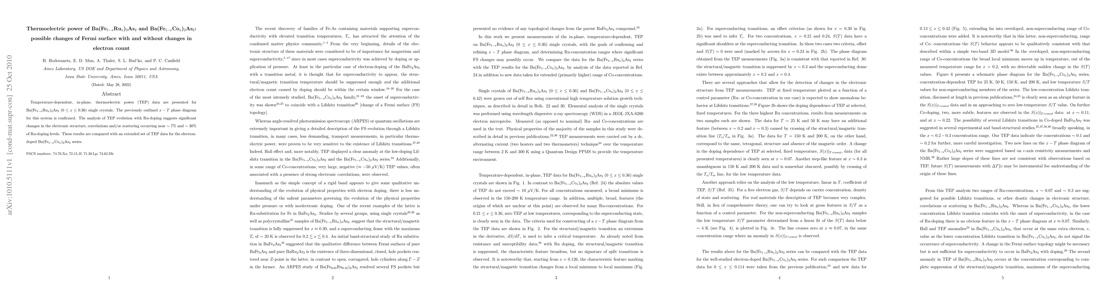 This paper investigates the thermoelectric power of Ba(Fe1-xRux)2As2 and Ba(Fe1-xCox)2As2, revealing significant changes in electronic structure and Fermi surface with Ru-doping at ~7% and ~30%, and comparing these findings with electron-doped Ba(Fe1-xCox)2As2. These results suggest complex interactions between doping, electron count, and thermoelectric properties.