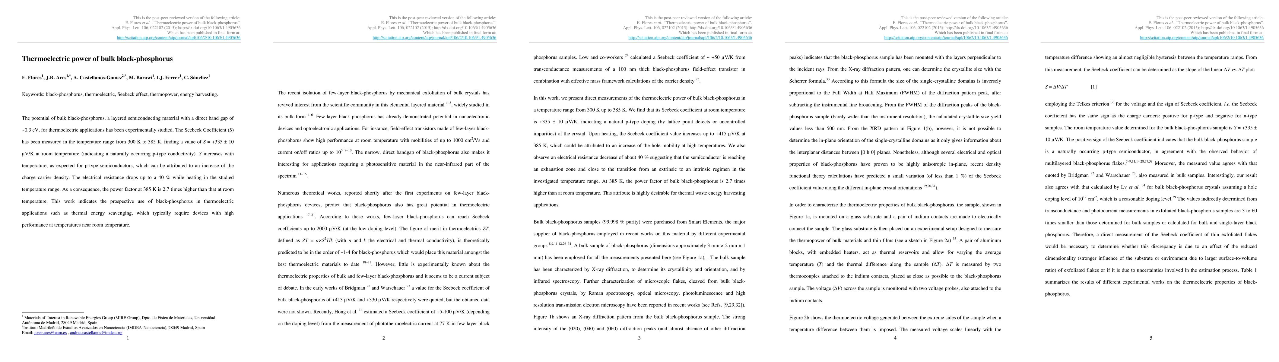 This study experimentally investigates the thermoelectric properties of bulk black-phosphorus, finding a positive Seebeck coefficient indicating p-type conductivity, with the power factor increasing by 2.7 times from room temperature to 385 K, suggesting its potential for high-temperature thermoelectric applications.