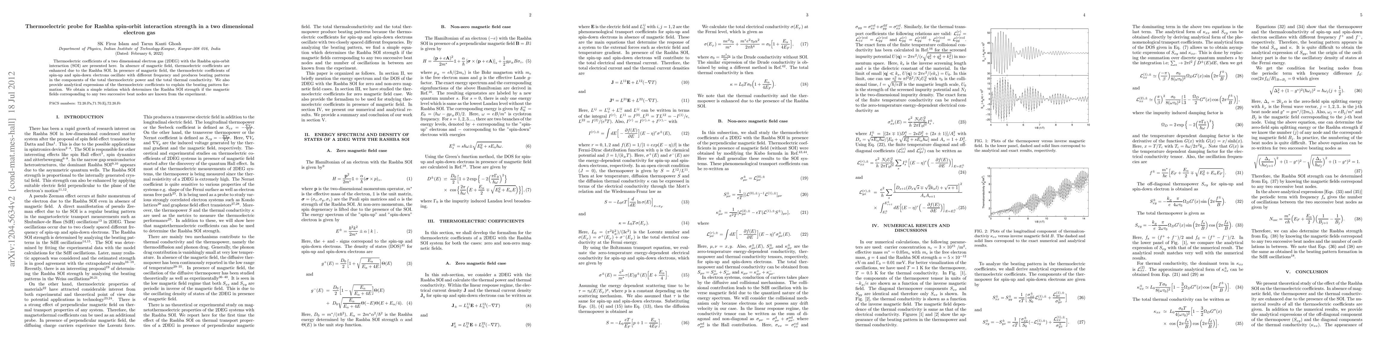 This paper investigates thermoelectric coefficients in a two-dimensional electron gas with Rashba spin-orbit interaction, showing enhanced coefficients without a magnetic field. In a magnetic field, oscillations in thermoelectric coefficients of spin-up and spin-down electrons create beating patterns, with analytical expressions provided to explain these phenomena and a relation derived to determine the Rashba spin-orbit interaction strength.