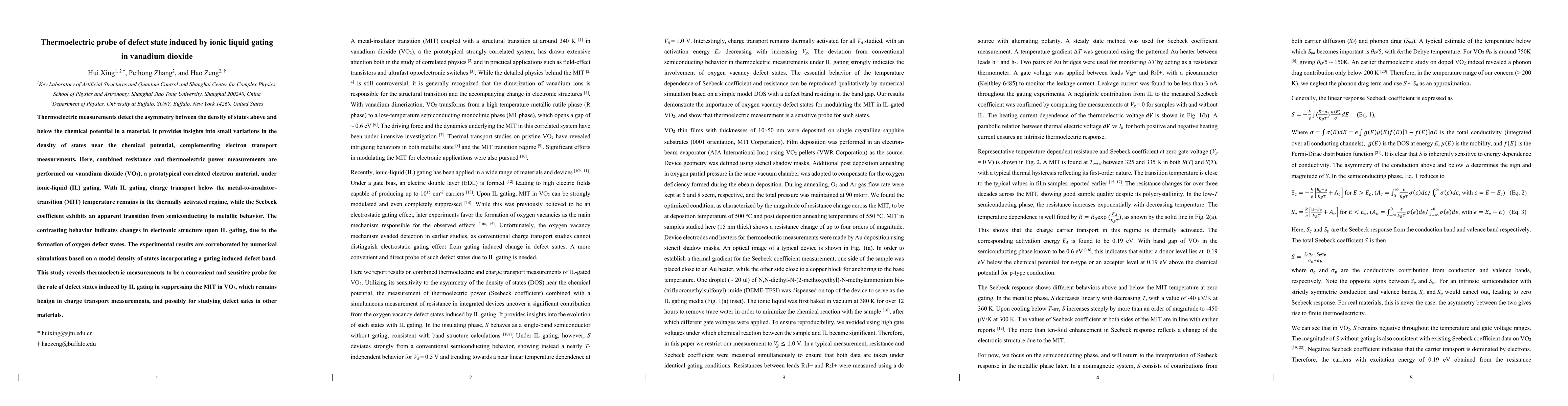This paper demonstrates thermoelectric measurements as a sensitive probe for identifying defect states induced by ionic liquid gating in vanadium dioxide, revealing changes in electronic structure that suppress the metal-to-insulator transition, while charge transport remains thermally activated. Numerical simulations corroborate these findings, highlighting the utility of thermoelectric methods in studying defect states.