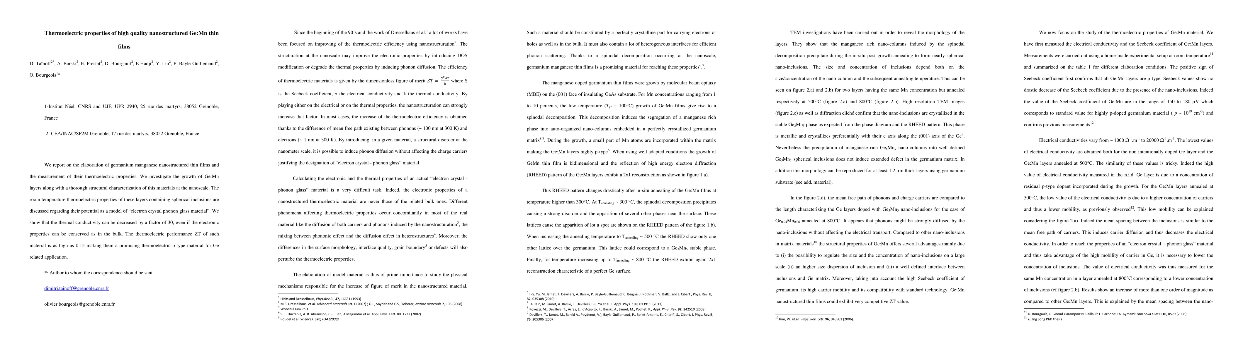 We report on the elaboration of germanium manganese nanostructured thin films and the measurement of their thermoelectric properties. We investigate the growth of Ge:Mn layers along with a thorough structural characterization of this materials at the nanoscale. The room temperature thermoelectric properties of these layers containing spherical inclusions are discussed regarding their potential as a model of "electron crystal phonon glass material". We show that the thermal conductivity can be decreased by a factor of 30, even if the electronic properties can be conserved as in the bulk. The thermoelectric performance ZT of such material is as high as 0.15 making them a promising thermoelectric p-type material for Ge related application.