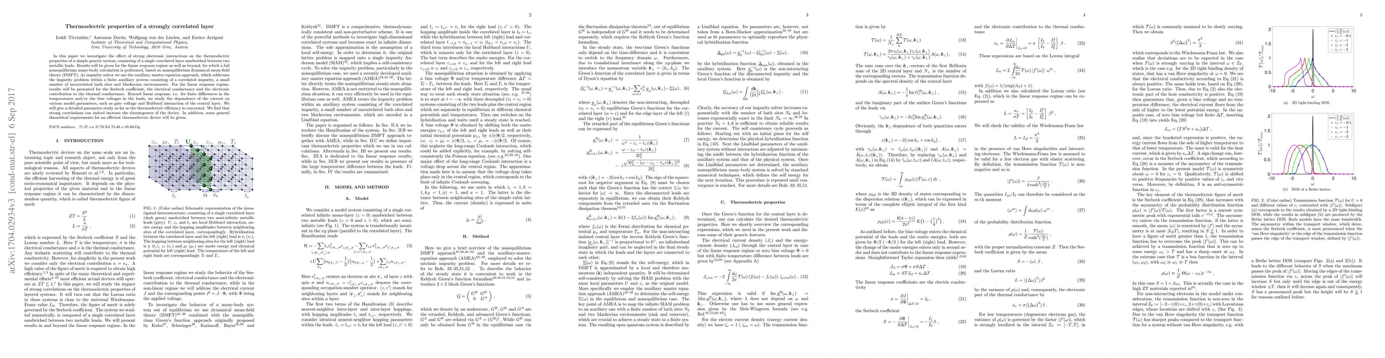 This paper explores the thermoelectric properties of a single correlated layer under strong electronic interactions, using nonequilibrium DMFT and the auxiliary master equation approach. It finds that strong correlations can enhance the thermopower, and provides theoretical insights into efficient thermoelectric devices.