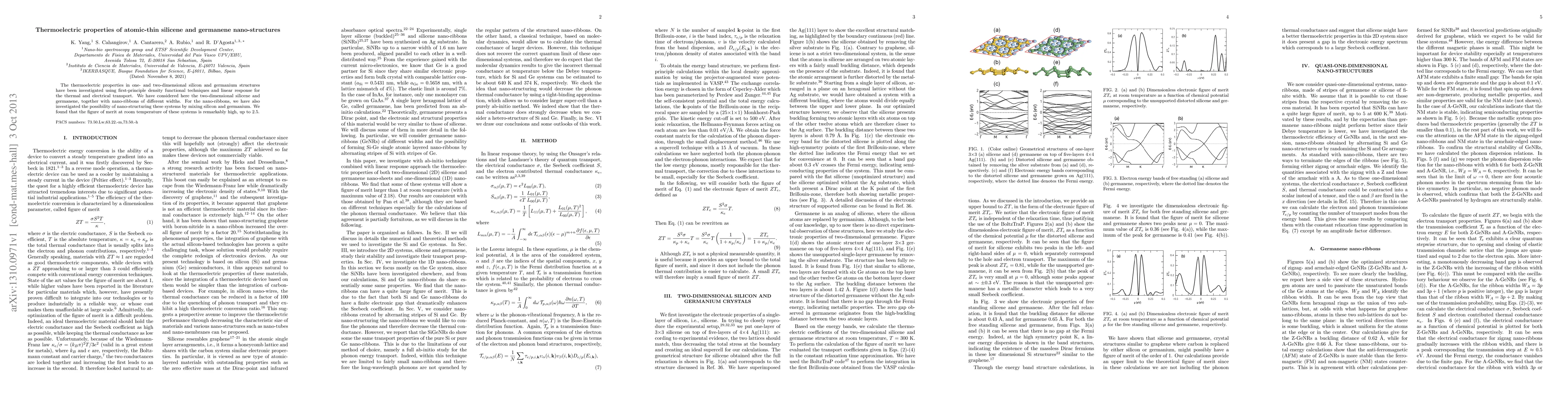 The thermoelectric properties in one- and two-dimensional silicon and germanium structures have been investigated using first-principle density functional techniques and linear response for the thermal and electrical transport. We have considered here the two-dimensional silicene and germanene, together with nano-ribbons of different widths. For the nano-ribbons, we have also investigated the possibility of nano-structuring these systems by mixing silicon and germanium. We found that the figure of merit at room temperature of these systems is remarkably high, up to 2.5.