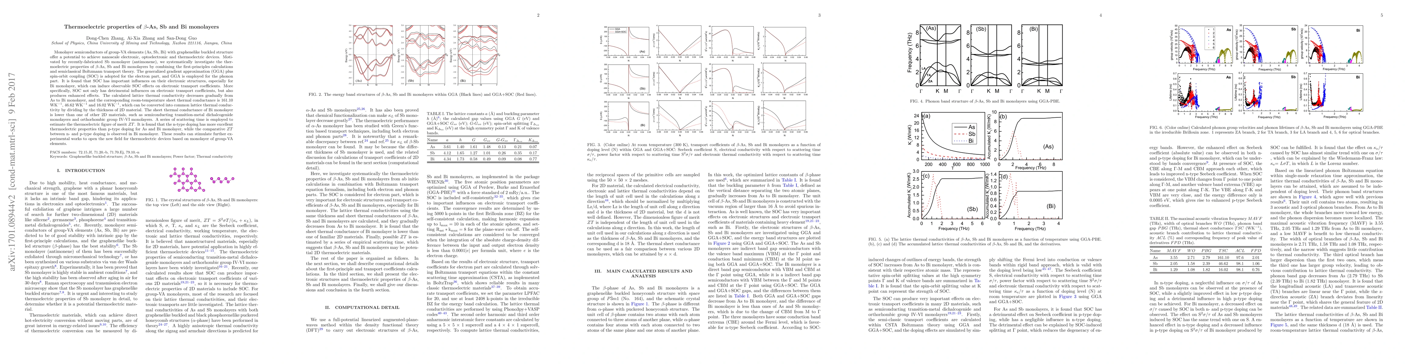 This study investigates the thermoelectric properties of $\beta$-As, Sb, and Bi monolayers using first-principles calculations and Boltzmann transport theory. Spin-orbit coupling (SOC) significantly influences electronic structures and transport coefficients, particularly in Bi monolayer. The lattice thermal conductivity decreases from As to Bi, with Bi showing the lowest sheet thermal conductance. The research concludes that n-type doping generally outperforms p-type doping in thermoelectric performance for As and Bi monolayers.