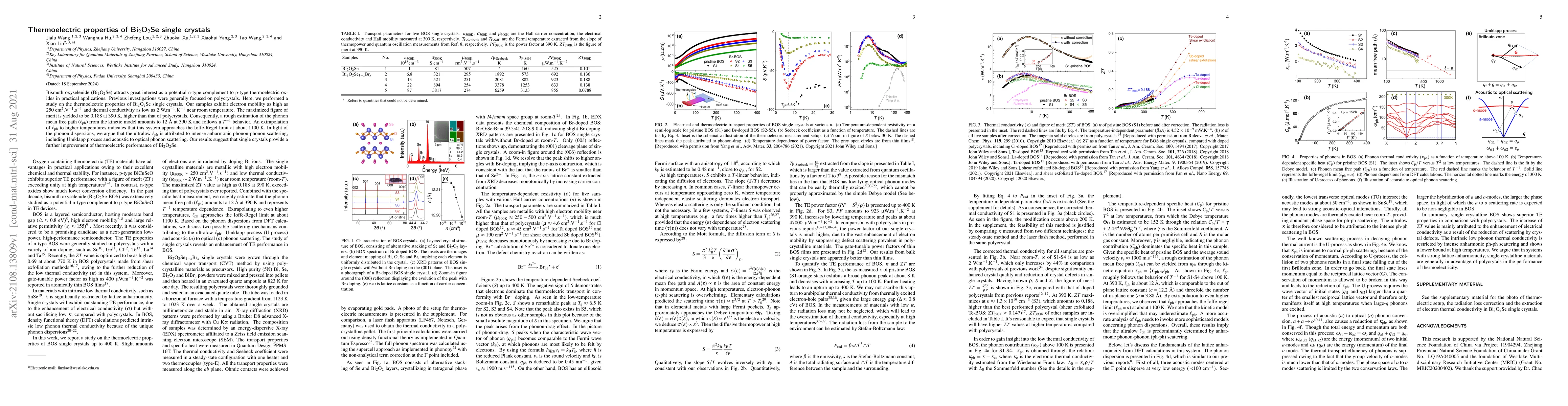 This study investigates the thermoelectric properties of Bi$_2$O$_2$Se single crystals, revealing high electron mobility and low thermal conductivity, resulting in a superior figure of merit compared to polycrystals. The ultralow phonon mean free path is attributed to strong anharmonic phonon scattering, suggesting enhanced thermoelectric performance in single crystals.