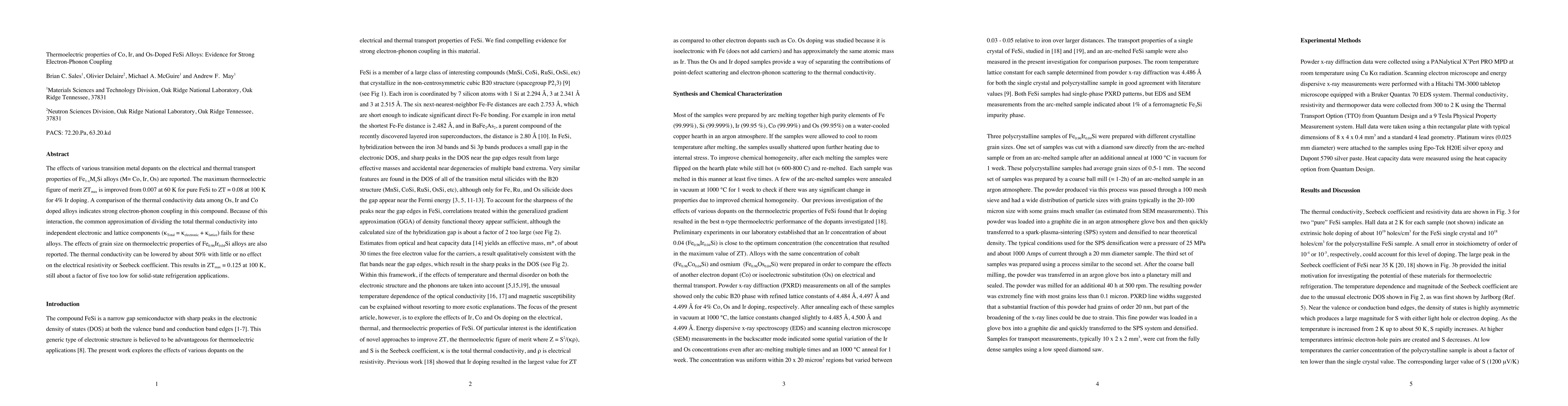 The effects of various transition metal dopants on the electrical and thermal transport properties of Fe1-xMxSi alloys (M= Co, Ir, Os) are reported. The maximum thermoelectric figure of merit ZTmax is improved from 0.007 at 60 K for pure FeSi to ZT = 0.08 at 100 K for 4% Ir doping. A comparison of the thermal conductivity data among Os, Ir and Co doped alloys indicates strong electron-phonon coupling in this compound. Because of this interaction, the common approximation of dividing the total thermal conductivity into independent electronic and lattice components ({\kappa}Total = {\kappa}electronic + {\kappa}lattice) fails for these alloys. The effects of grain size on thermoelectric properties of Fe0.96Ir0.04Si alloys are also reported. The thermal conductivity can be lowered by about 50% with little or no effect on the electrical resistivity or Seebeck coefficient. This results in ZTmax = 0.125 at 100 K, still about a factor of five too low for solid-state refrigeration applications.