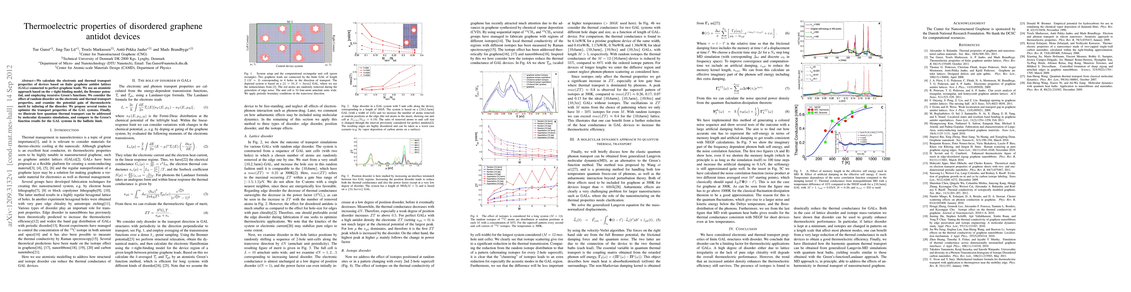 The paper presents a comprehensive analysis of electronic and thermal transport properties in disordered graphene antidot devices, proposing methods to optimize transport properties via disorder tailoring.