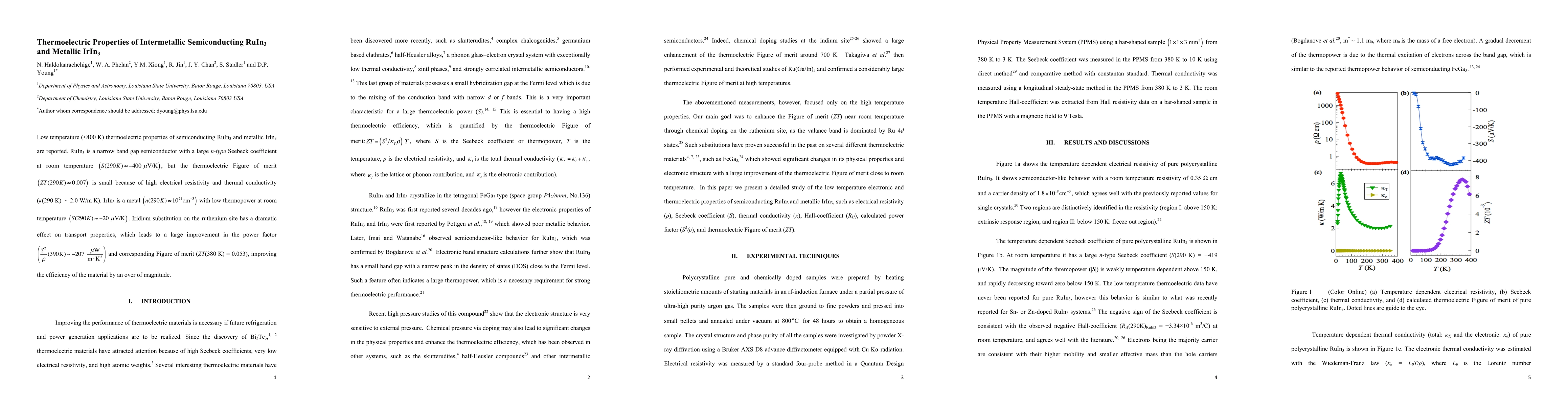 Low temperature (<400 K) thermoelectric properties of semiconducting RuIn3 and metallic IrIn3 are reported. RuIn3 is a narrow band gap semiconductor with a large n-type Seebeck coefficient at room temperature (S(290K)~400 {\mu}V/K), but the thermoelectric Figure of merit (ZT(290K) = 0.007) is small because of high electrical resistivity and thermal conductivity ({\kappa}(290 K) ~ 2.0 W/m K). IrIn3 is a metal with low thermopower at room temperature (S(290K)~20 {\mu}V/K) . Iridium substitution on the ruthenium site has a dramatic effect on transport properties, which leads to a large improvement in the power factor and corresponding Figure of merit (ZT(380 K) = 0.053), improving the efficiency of the material by an over of magnitude.