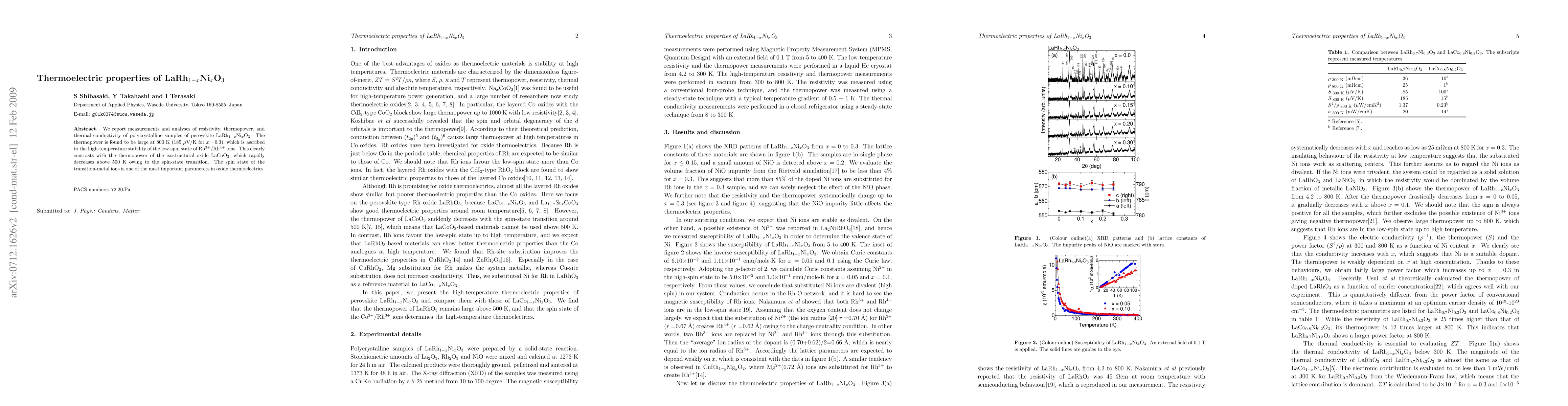 We report measurements and analyses of resistivity, thermopower, and thermal conductivity of polycrystalline samples of perovskite LaRh$_{1-x}$Ni$_x$O$_3$. The thermopower is found to be large at 800 K (185 $\mu$V/K for $x=$0.3), which is ascribed to the high-temperature stability of the low-spin state of Rh$^{3+}$/Rh$^{4+}$ ions. This clearly contrasts with the thermopower of the isostructural oxide LaCoO$_3$, which rapidly decreases above 500 K owing to the spin-state transition. The spin state of the transition-metal ions is one of the most important parameters in oxide thermoelectrics.
