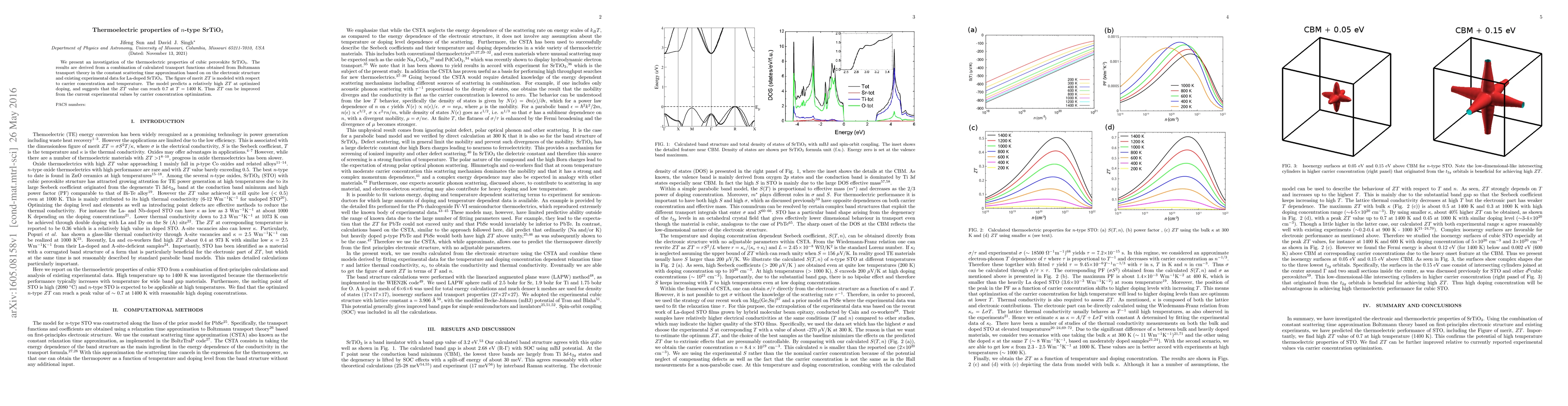 This research models the thermoelectric properties of SrTiO3, predicting a high figure of merit ZT of 0.7 at 1400K with optimal doping, suggesting potential improvements in thermoelectric efficiency via carrier concentration optimization.