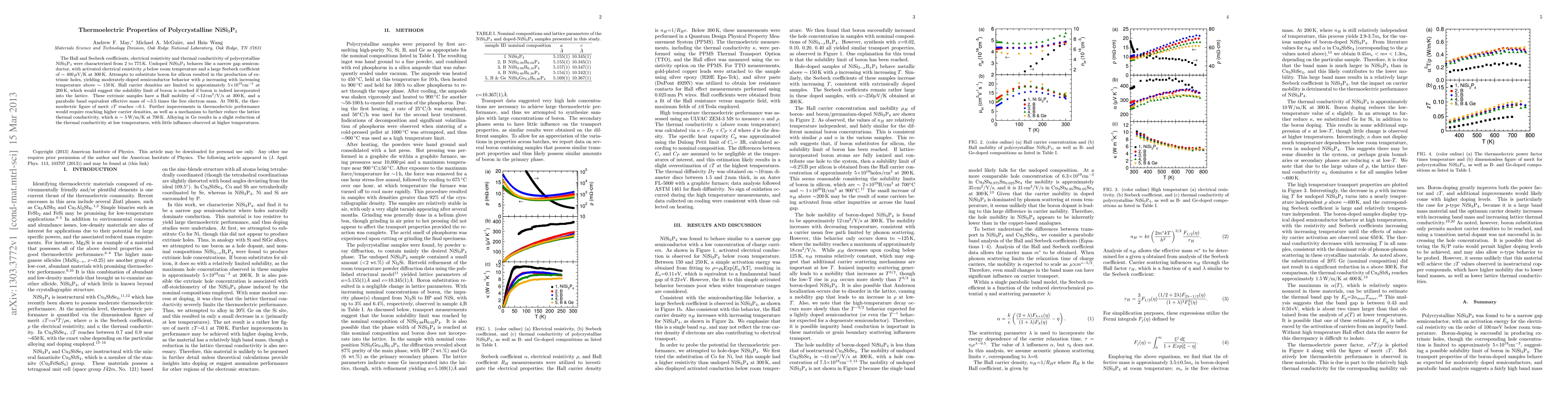 This study investigates the thermoelectric properties of polycrystalline NiSi3P4, finding it behaves as a narrow gap semiconductor with a large Seebeck coefficient. Doped samples with boron show increased resistivity and moderate semiconductor behavior, achieving a thermoelectric figure of merit (zT) of ~0.1 at 700K, though further enhancements are needed to reach higher carrier densities and lower lattice thermal conductivity.