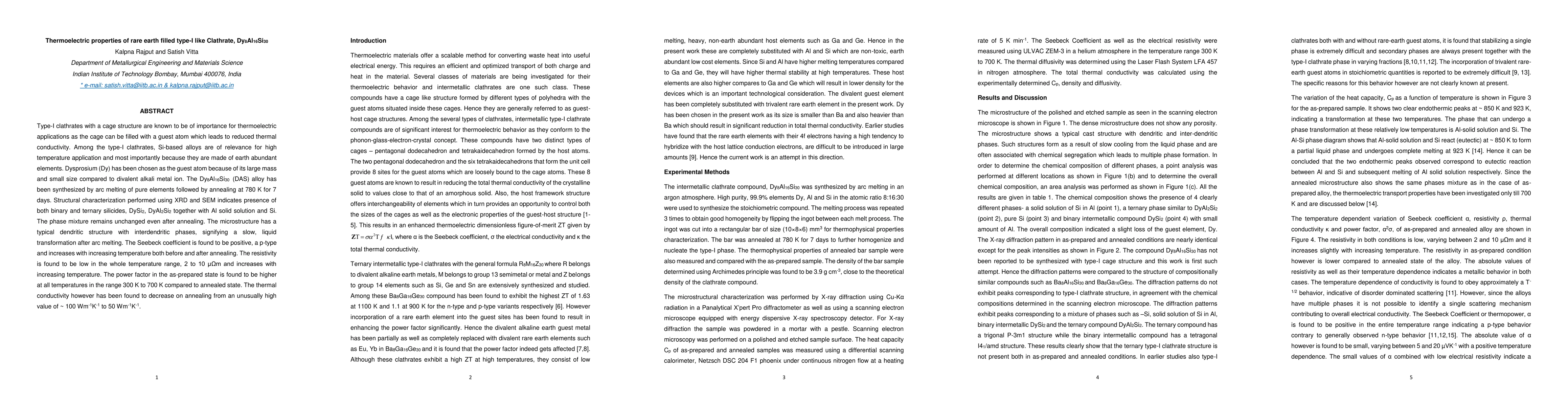 Type-I clathrates with a cage structure are known to be of importance for thermoelectric applications as the cage can be filled with a guest atom which leads to reduced thermal conductivity. Among the type-I clathrates, Si-based alloys are of relevance for high temperature application and most importantly because they are made of earth abundant elements. Dysprosium, Dy has been chosen as the guest atom because of its large mass and small size compared to divalent alkali metal ion. The Dy8Al16Si30, DAS, alloy has been synthesized by arc melting of pure elements followed by annealing at 780 K for 7 days. Structural characterization performed using XRD and SEM indicates presence of both binary and ternary silicides, DySi2, DyAl2Si2 together with Al solid solution and Si. The phase mixture remains unchanged even after annealing. The microstructure has a typical dendritic structure with interdendritic phases, signifying a slow, liquid transformation after arc melting. The Seebeck coefficient is found to be positive, a p-type and increases with increasing temperature both before and after annealing. The resistivity is found to be low in the whole temperature range, 2 to 10 micro Ohm m and increases with increasing temperature. The power factor in the as-prepared state is found to be higher at all temperatures in the range 300 K to 700 K compared to annealed state. The thermal conductivity however has been found to decrease on annealing from an unusually high value of 100 W/m K to 50 W/m K.
