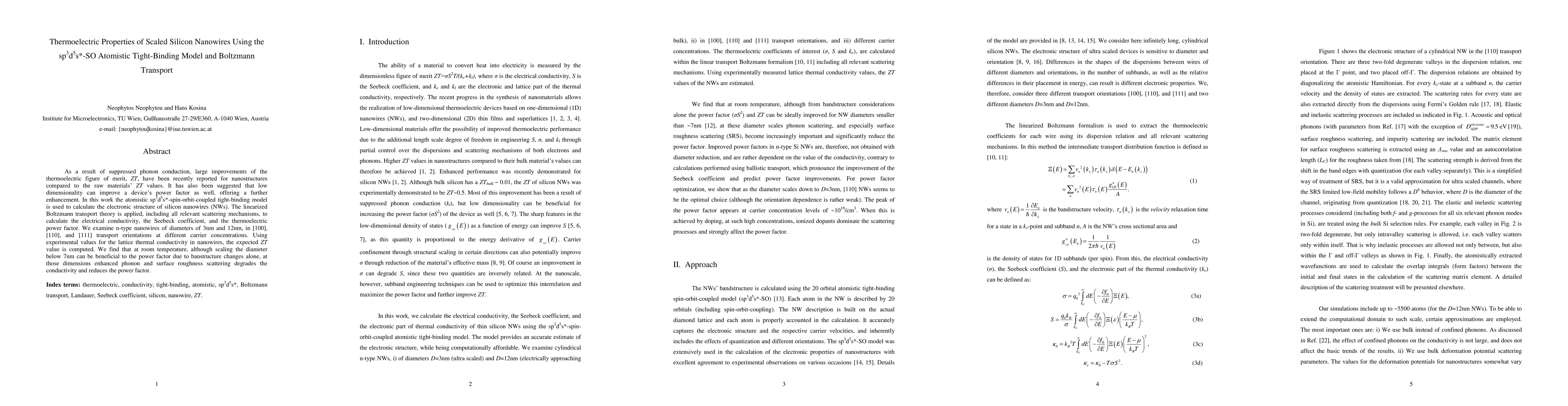 This paper investigates the thermoelectric properties of silicon nanowires using an atomistic tight-binding model and Boltzmann transport theory, finding that while smaller diameters enhance power factor due to band structure changes, phonon scattering and surface roughness effects reduce conductivity and overall thermoelectric performance at dimensions below 7nm.